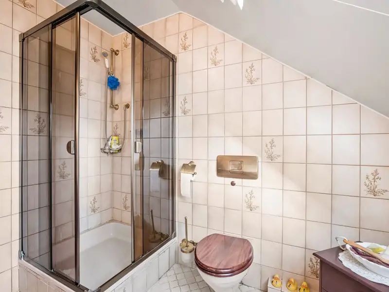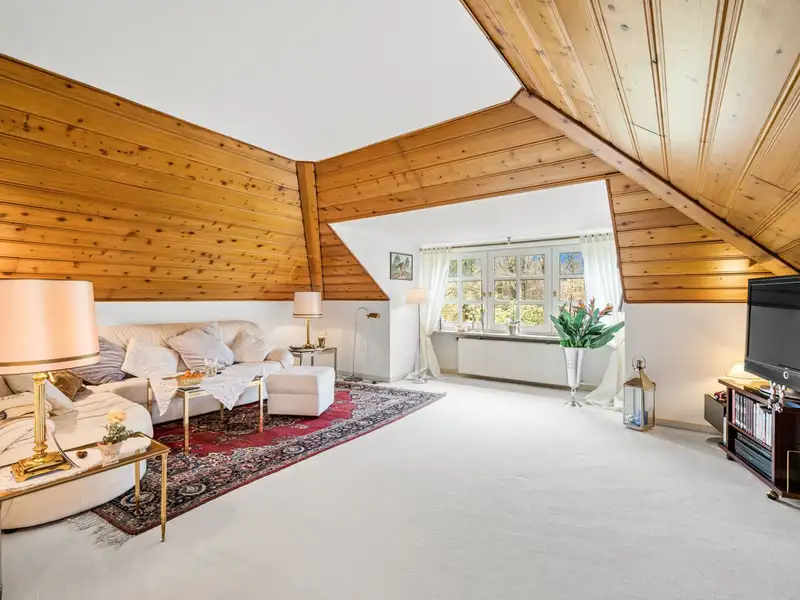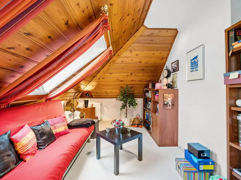 A hallway leads into the spacious living room, a children's room and a shower room. Another highlight here is the large window with a view of the natural surroundings. Enjoy the view and let your mind wander. The professionally completed conversion of the attic, which was approved in 1982, offers a very good addition to the existing living space.