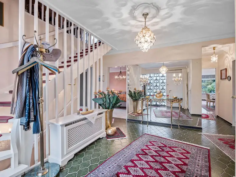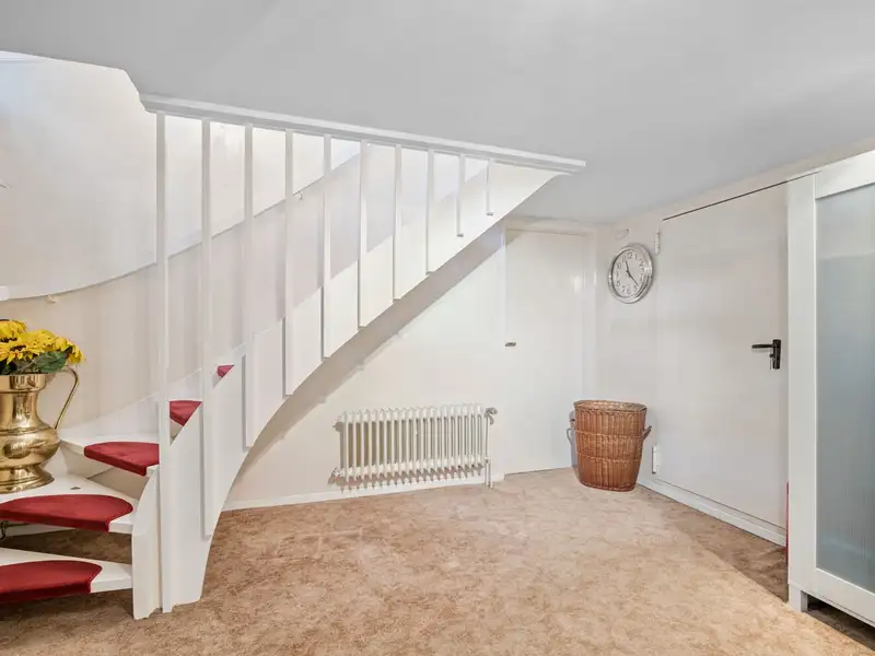 A practical extra of this property is the spacious garage with space for two cars. From here you have direct access to the basement with a total usable area of approx. 130 m². The cozy hallway is equipped with a checkroom and further storage space. The connections for the washing machine and dryer are located here.
