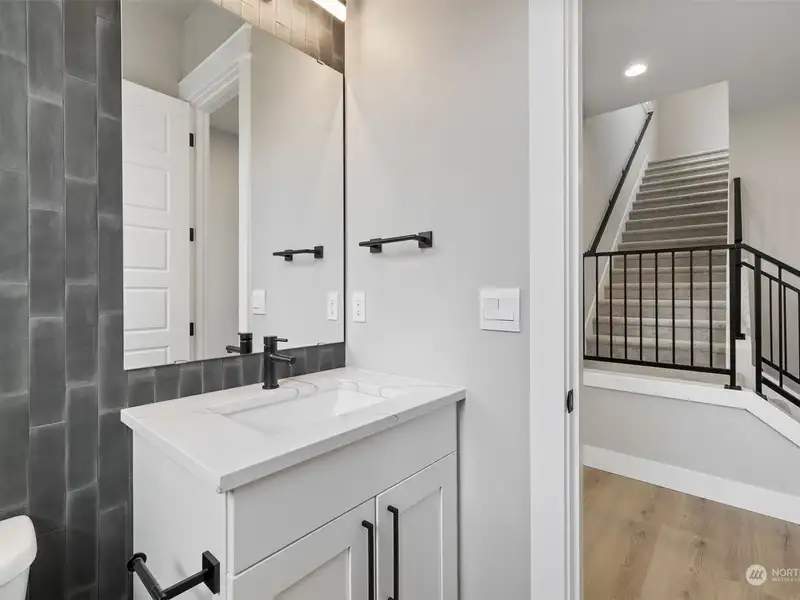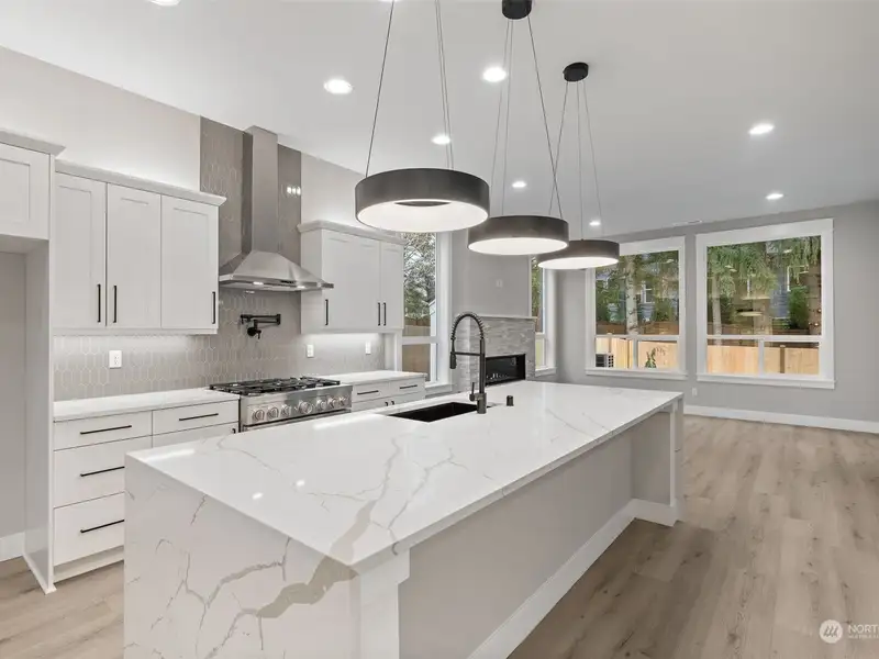 - Open kitchen with quartz waterfall counters