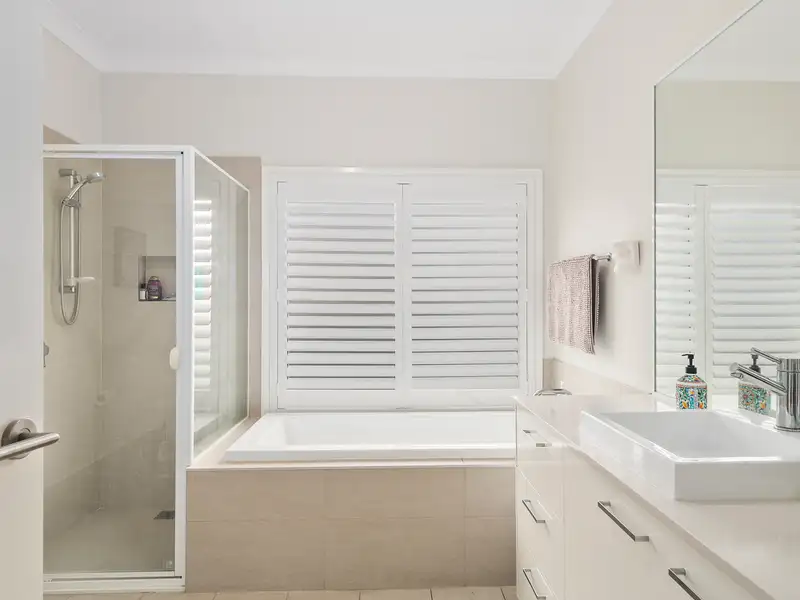 The main bedroom is a private retreat, featuring dual walk-in robes and a stylish ensuite. Three further double bedrooms with built-ins share a central bathroom with soaking tub, shower, and twin vanity.