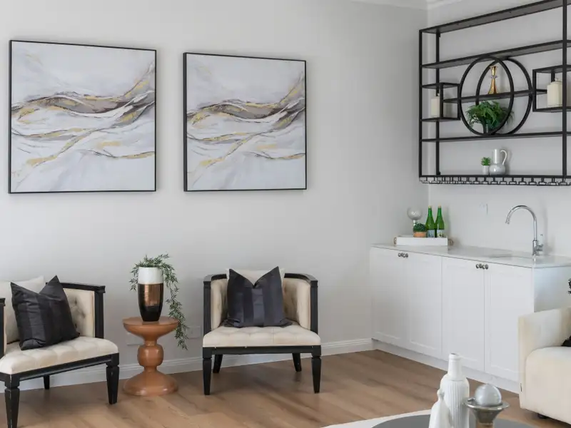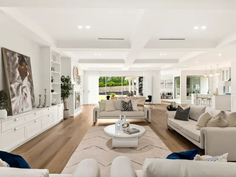 - Elevated 3m plus feature coffered ceilings, engineered oak flooring to central living areas, carpet to bedrooms, decorative lighting and sheer curtaining