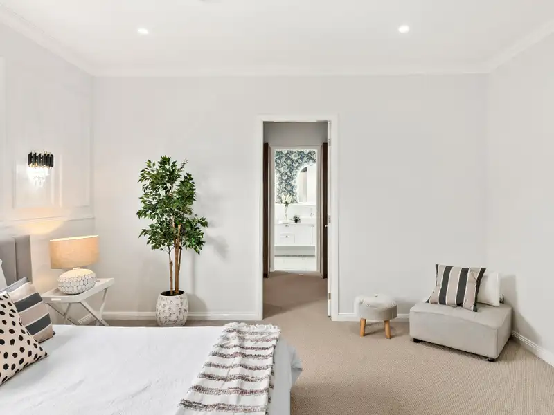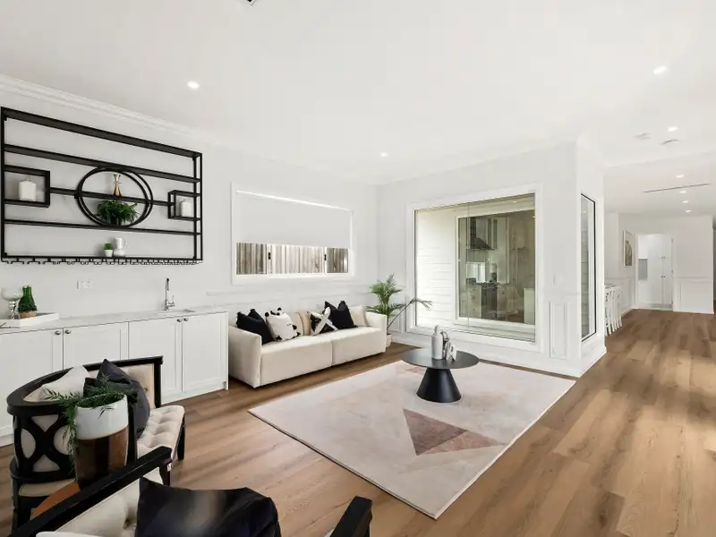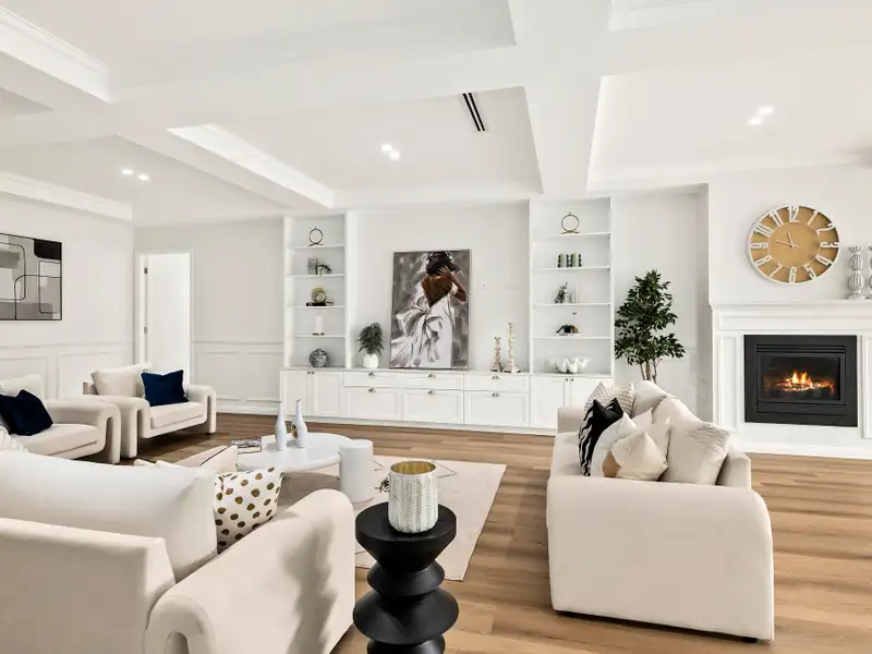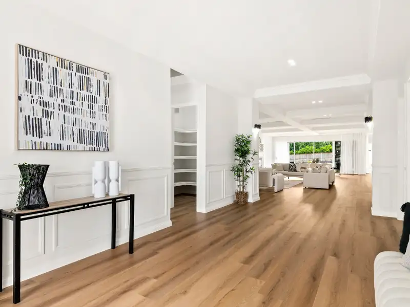 From the moment you step inside, the broad entryway sets a grand tone, opening to a beautifully curated interior where a blend of coffered elevated ceilings, neutral tones and bespoke finishes create a calming sense of light, space, and timeless elegance. Every detail has been considered, from the timber wall panelling to the abundance of natural light that floods each room, enhancing the home's effortless sophistication.