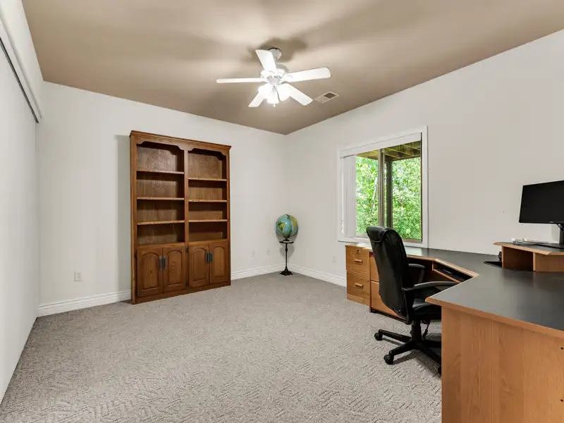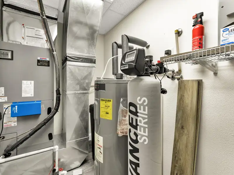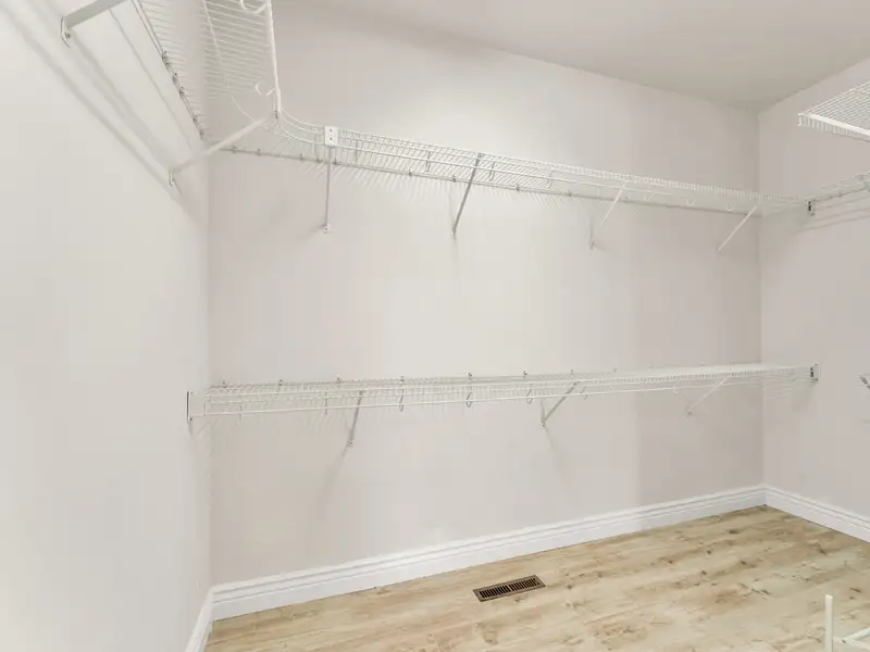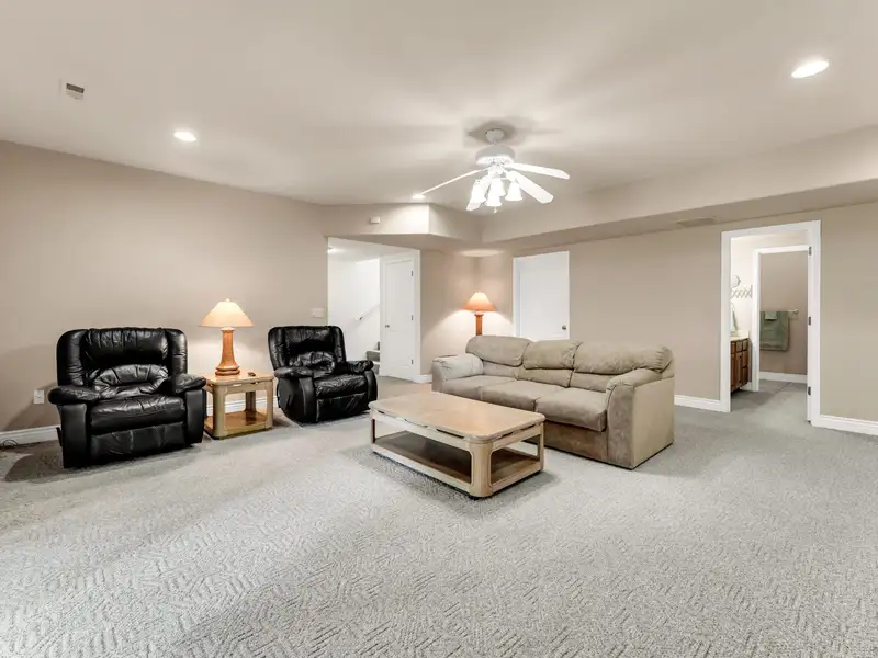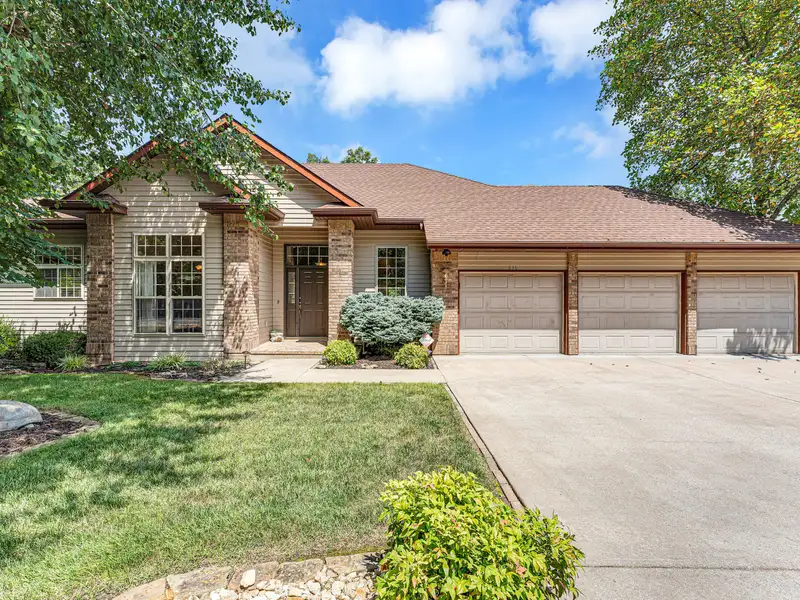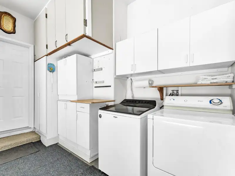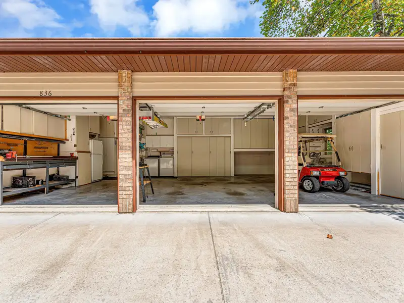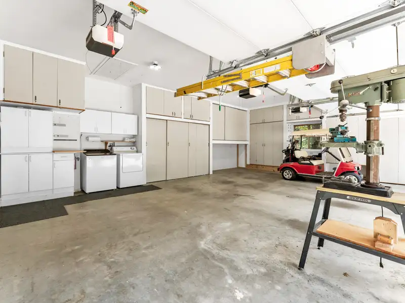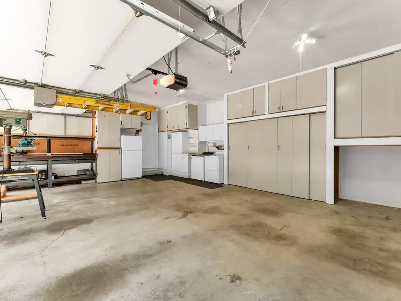 - Three-car garage with storage cabinets and workbench
