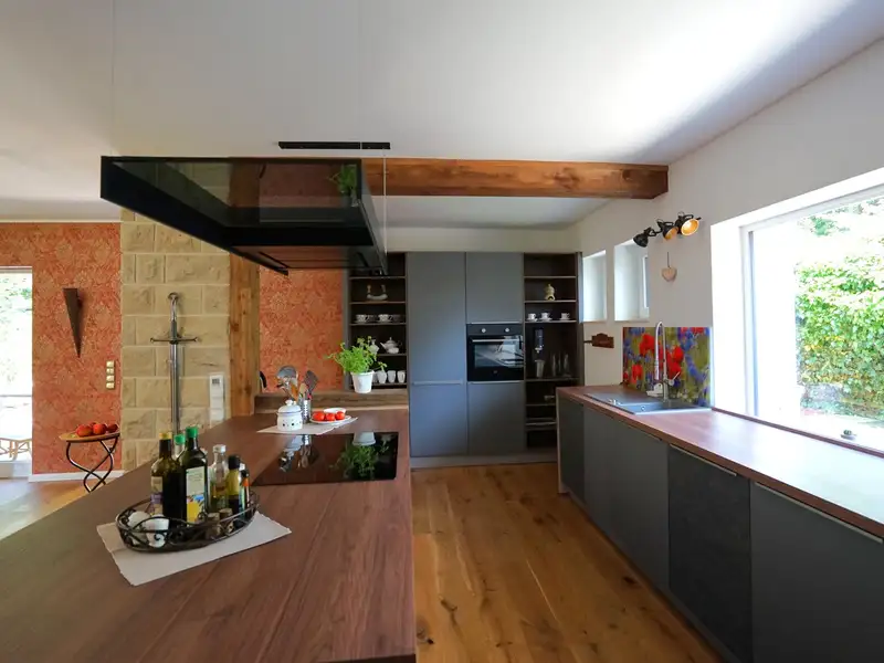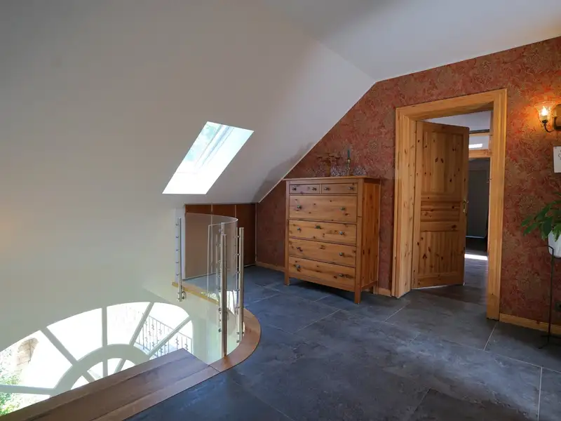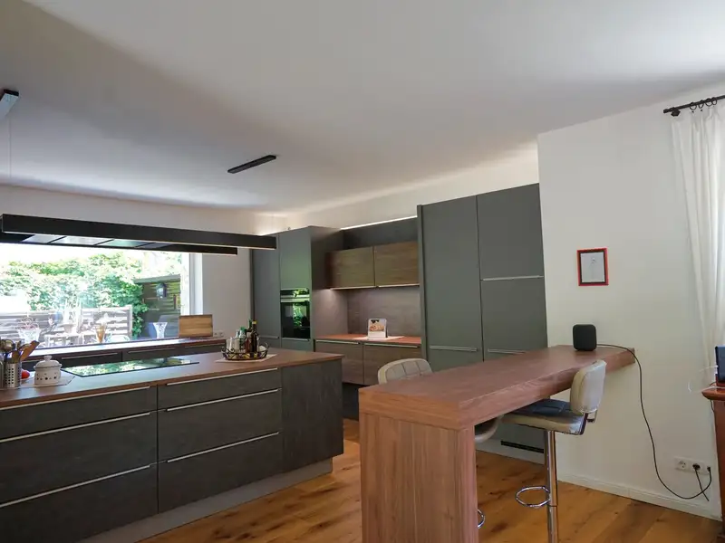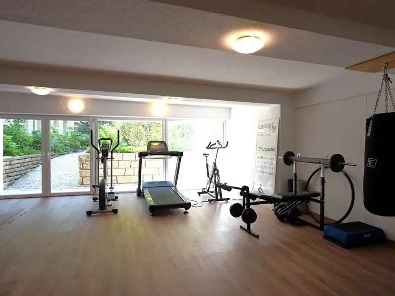The house extends over three floors and has a spacious living room, a dining room with adjoining open-plan kitchen as well as several bedrooms and studies that can be individually designed, two bathrooms and a guest WC. The exclusive fitted kitchen is equipped with modern appliances, making it a wonderful place to cook and enjoy. Several large terraces and outdoor seating areas in different areas as well as a conservatory offer plenty of space for relaxation and social gatherings with friends and family. For fitness enthusiasts, there is an integrated fitness room in the basement with a pool table and direct access to the garden. A party room has also been set up. A large workshop with a separate sawing room offers hobby craftsmen the ideal space for creative projects.
