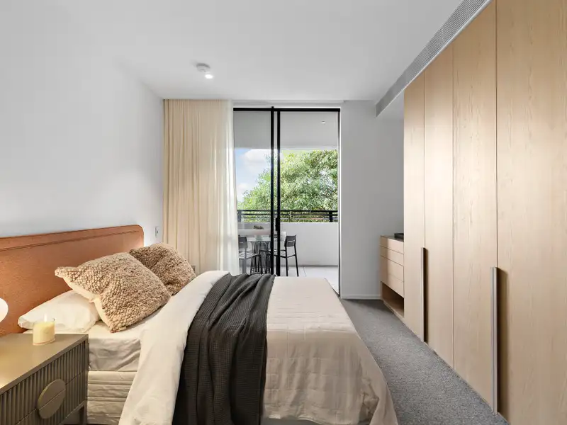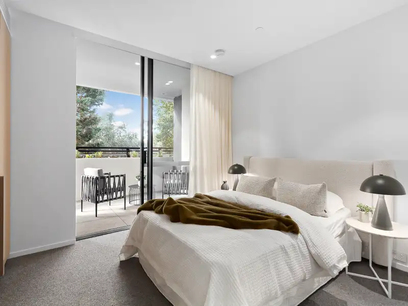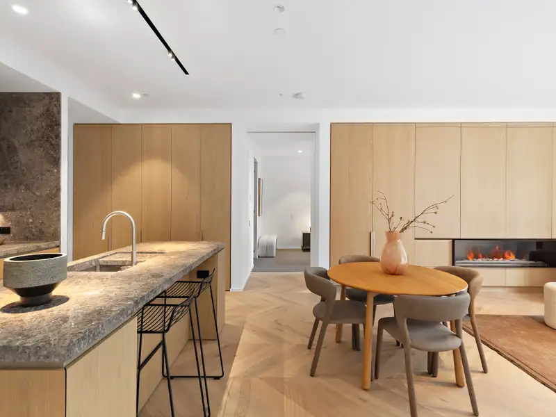 Spanning 97sqm of refined internal living plus 24sqm of private outdoor sanctuary, the apartment showcases a spacious north-facing living and dining room with a Planika fireplace, a feature incorporated in only a select few residences. The alfresco entertaining terrace, framed by greenery and planter boxes, brings a sense of calm and connection to the outdoors.