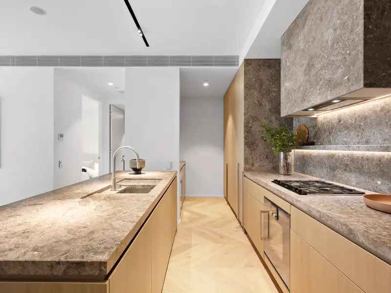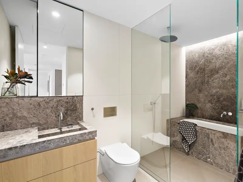 The two bedrooms are zoned on either side of the floorplan for privacy, each opening to the terrace. The main bedroom features a luxurious ensuite with twin vanities and a cascading rain shower. A central bathroom serves the second bedroom with a deep soaking tub and its own rain shower. Matching marble flows throughout the bathrooms, kitchen and hidden European laundry, creating visual harmony and quiet consistency.