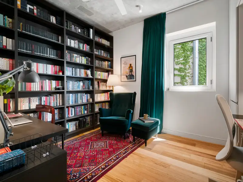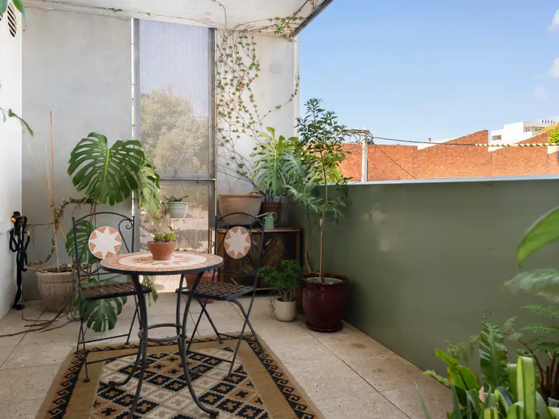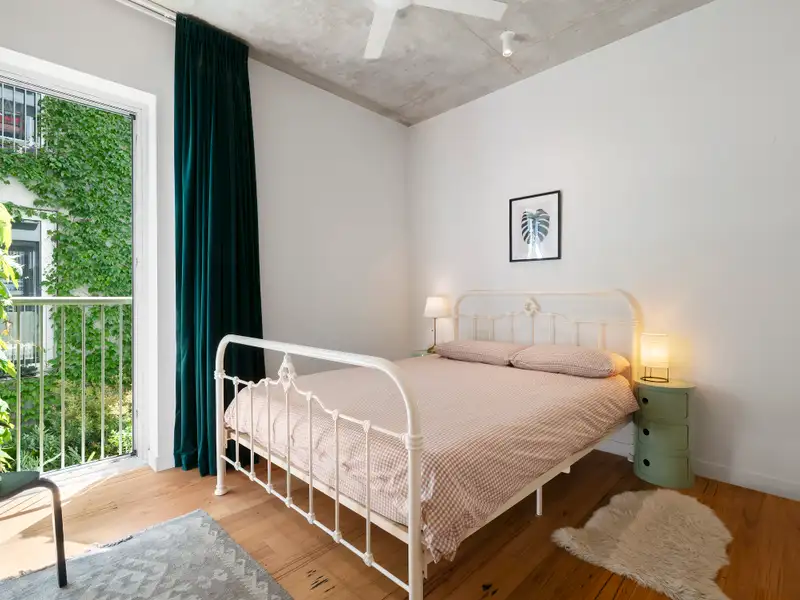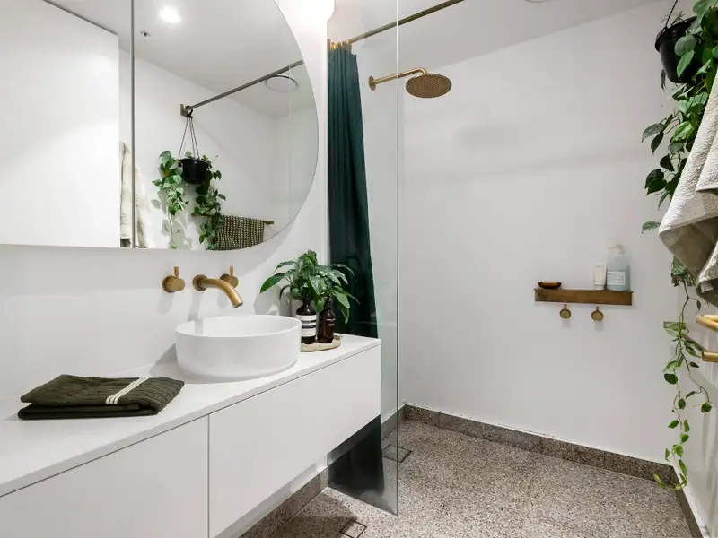 Both bedrooms feature hardwood flooring and are filled with light. The primary bedroom includes a built-in vanity, ample storage, a ceiling fan and a north-facing Juliette balcony that opens to a tranquil fern garden and climbing plants. This room enjoys gentle morning north-facing sunshine and is quietly positioned at the rear of the apartment. The second bedroom, also ideal as a dedicated study as shown by the current owners, is a bright, adaptable space for work or relaxation. The bespoke bathroom includes a terrazzo tiled walk-in shower with brass fittings, a stylish half-circle mirrored cabinet and generous vanity storage. This apartment also features a separate WC to the bathroom, with terrazzo flooring and additional vanity basin.