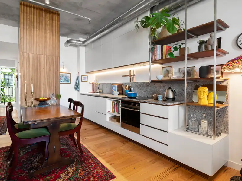 The apartment delivers a beautiful south-facing aspect, a 7.9 NatHERS rating, high ceilings, double glazing, hydronic heating, ceiling fans and engineered floorboards. The living room features two floor-to-ceiling south-facing double-glazed doors that open onto the generous terrace, offering sweeping views, including glimpses of the city, and abundant natural light. The galley-style kitchen is beautifully appointed with a terrazzo stone benchtop and splashback, Fisher & Paykel double-drawer dishwasher, induction cooktop, electric oven, pull-out pantry, bespoke cabinetry and extensive storage. A unique south-facing lightwell illuminates the kitchen with natural light and fresh air while overlooking serene views.