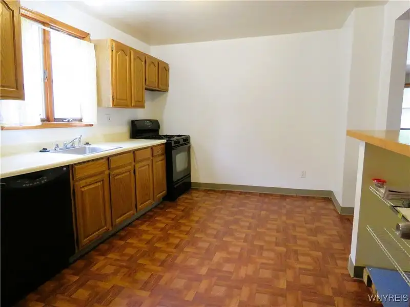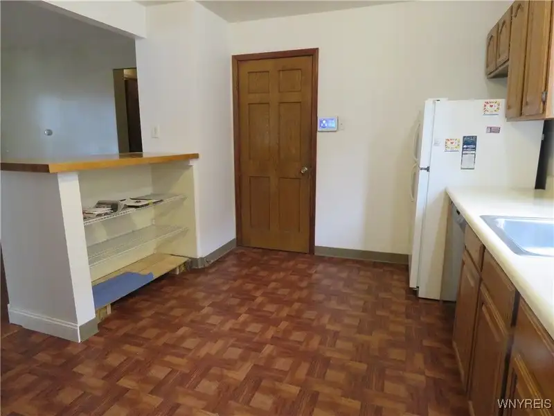 - Kitchen with breakfast bar and oak cabinets