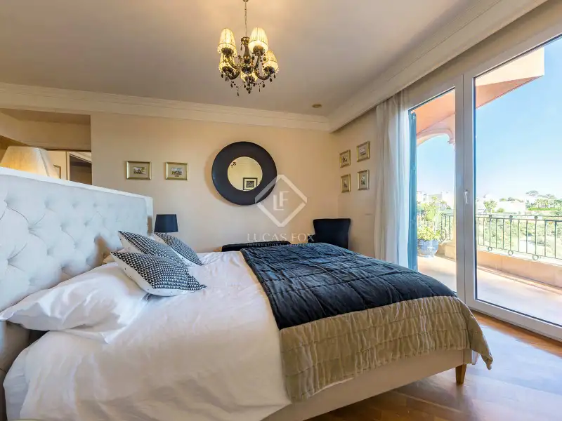 We are welcomed into the property on the ground floor by an elegant reception hall leading to the spacious living room with high ceilings and a sitting room with a fireplace. To one side we find the library/TV room and entrance to the beautiful master bedroom, facing the sea, with a large walk-in wardrobe and full travertine marble bathroom.