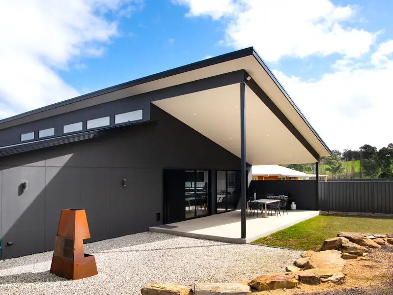 The design continues outdoors, where an expansive covered patio mirrors the drama of the raked ceilings inside, providing a seamless flow from indoor living to open-air relaxation. The grounds are equally well-prepared, with irrigated level lawns, water tanks, and side access, along with a levelled pad ready for the addition of a garage/workshop.