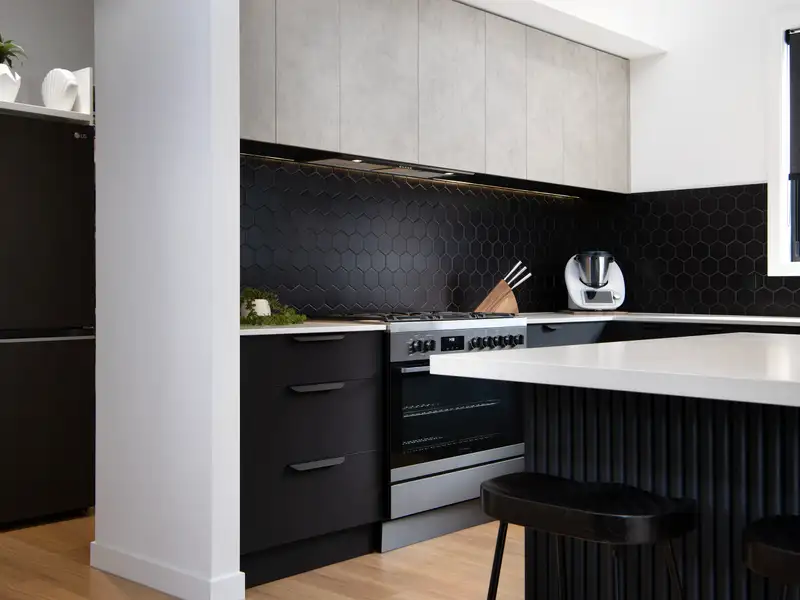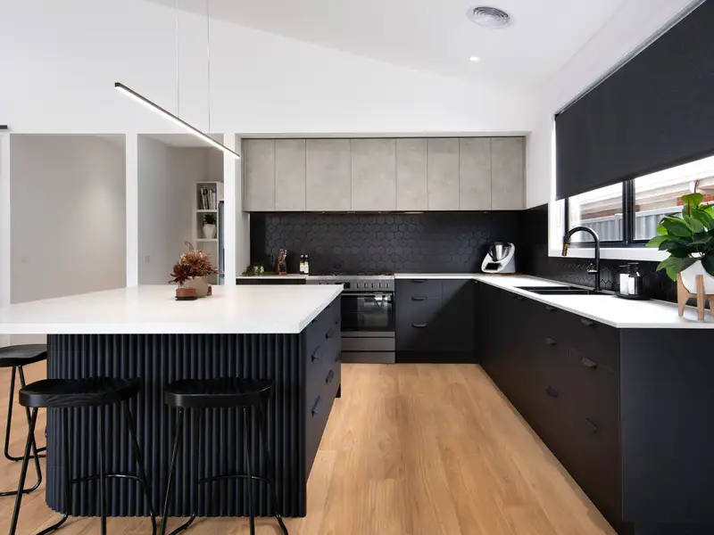 At its heart, the open-plan living space is a triumph of style and function, flooded with natural light through clerestory windows and lifted by soaring raked ceilings. The custom kitchen commands attention, it features stone benches, an oversized island, a walk-in pantry, and a 900mm Westinghouse cooker – a space built for cooking, entertaining, and gathering. Here, the home's design encourages connection, with seamless flow between living, dining, and outdoor areas that is perfect for family life or hosting in style.