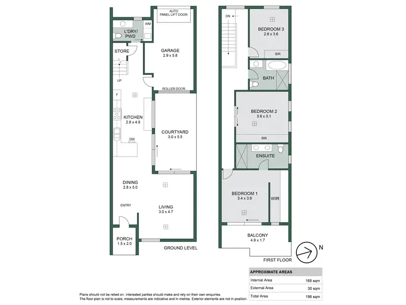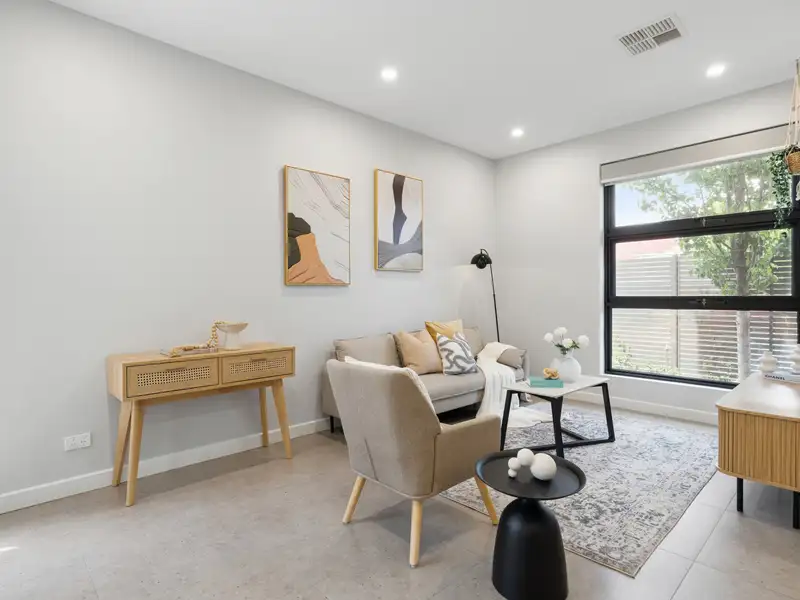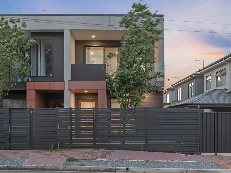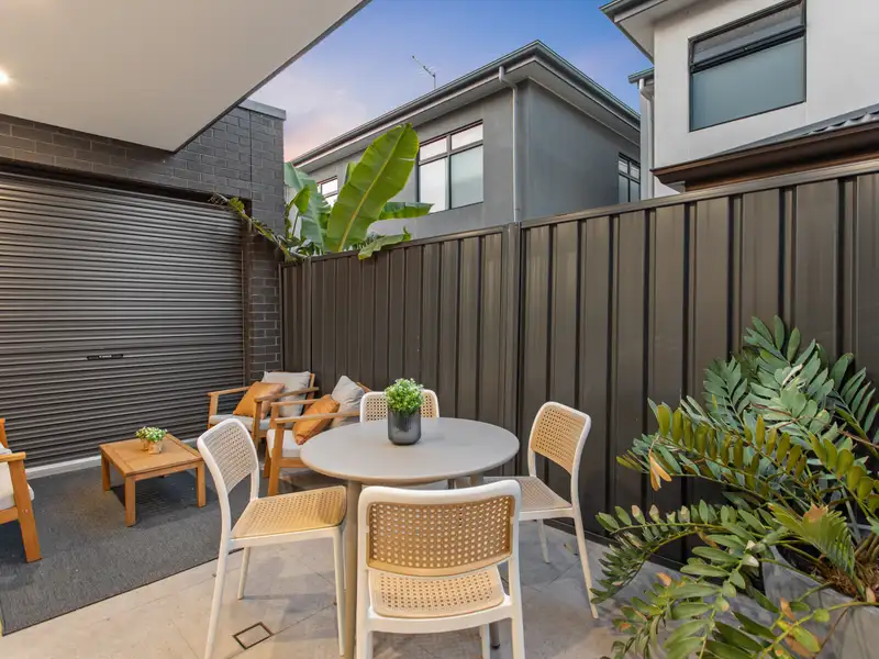 In the group of four quality townhomes, unit one features fully fenced street frontage with a secure entry gate and small garden. The shared driveway provides alternative access to the home through the rear-positioned single garage featuring an auto panel lift door and a rear roller door into a private courtyard.