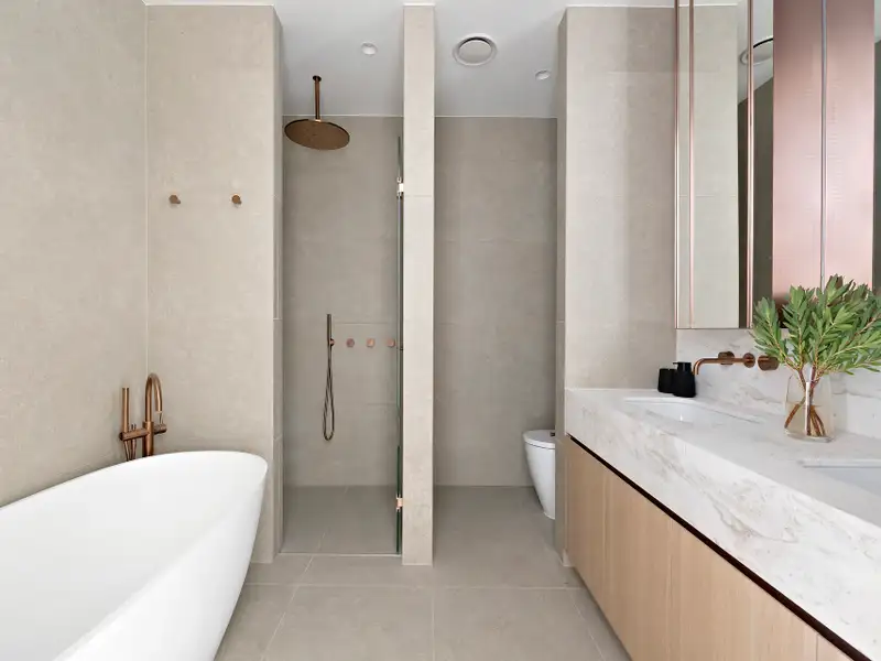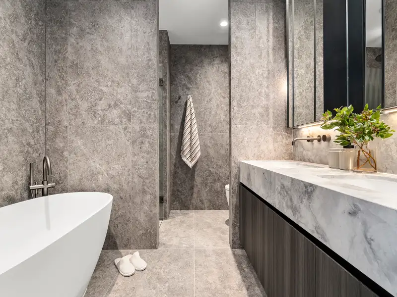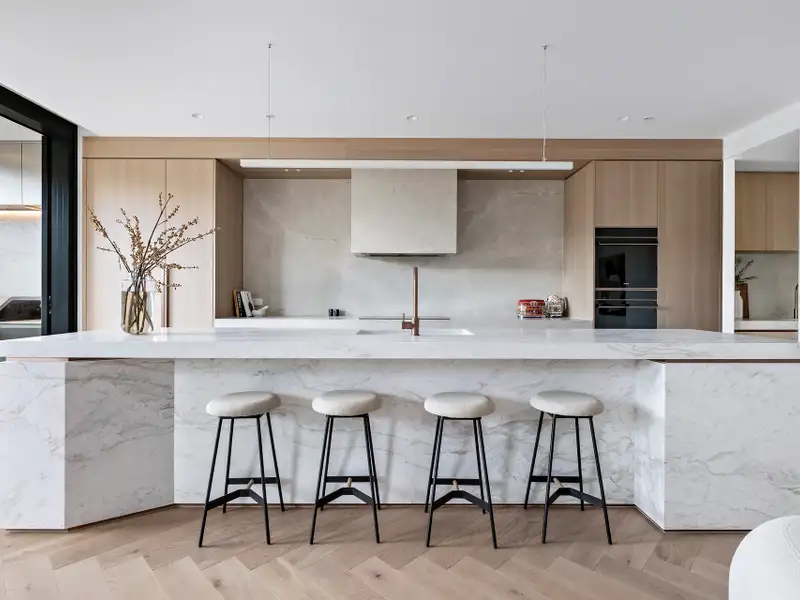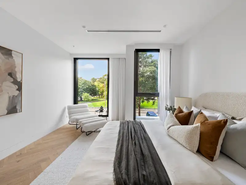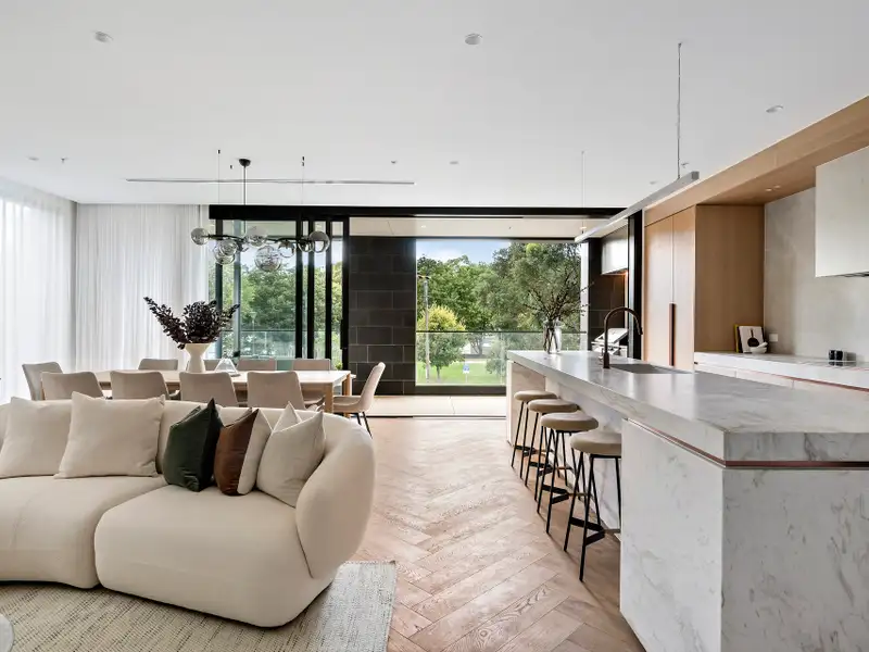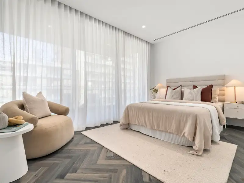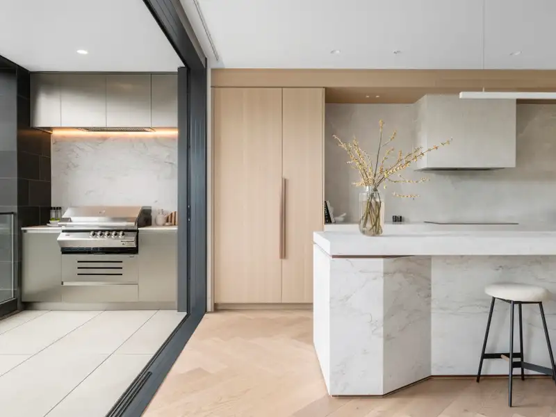 Apartment 401 offers an expansive 195sqm internal floorplan, complemented by a generous 35sqm terrace. The spacious open-plan living and dining area is anchored by a striking stone kitchen and a separate scullery, ready for 5-star cooking and entertaining. Full-width sliding doors lead to the terrace, complete with integrated BBQ, and frame sweeping views of the city skyline and towards Argyle Square Park.