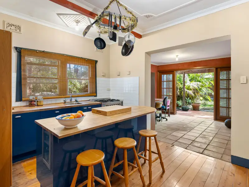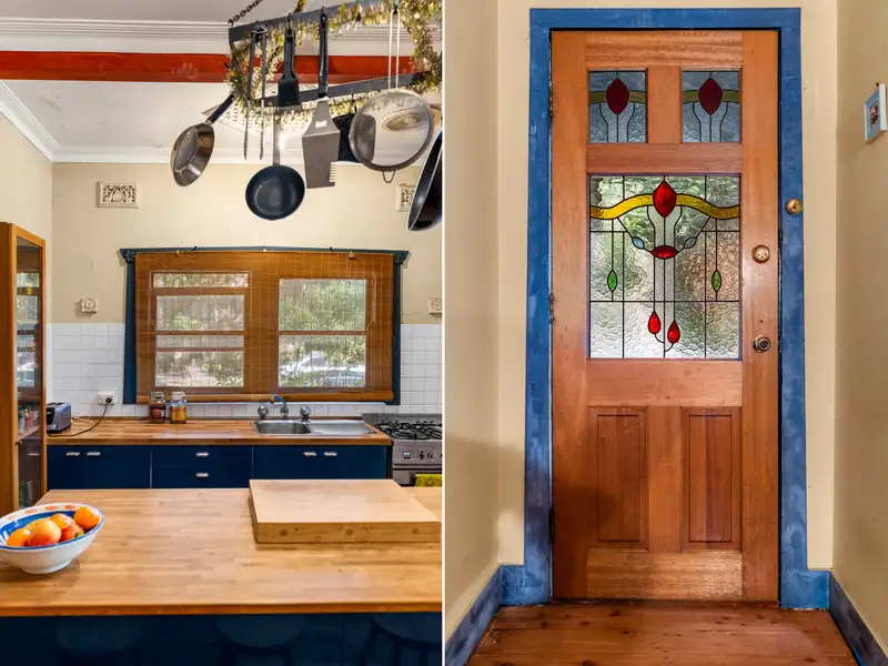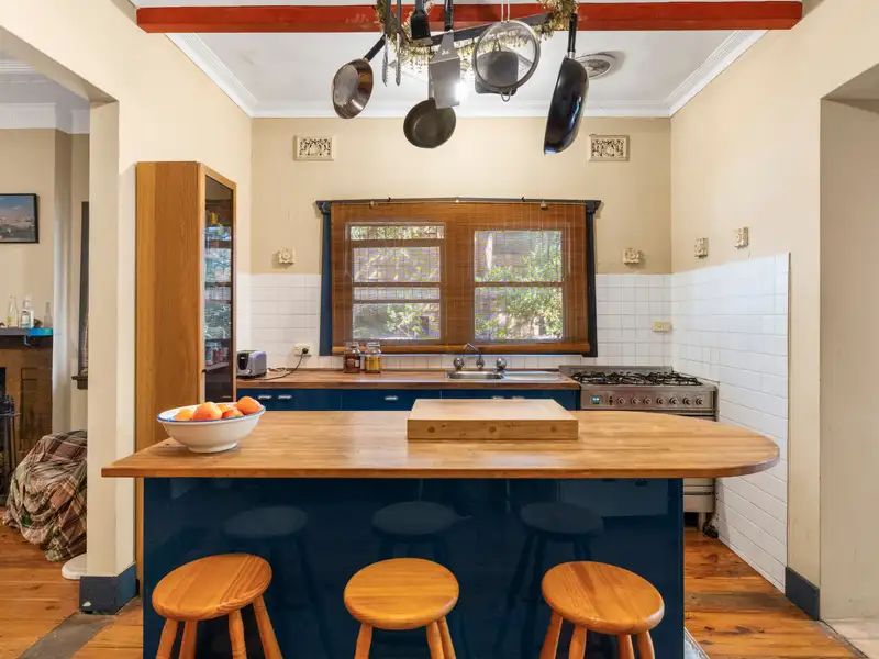- Open plan kitchen with an adjacent dining area, sash windows, timber picture rails, blinds and ornate period ceilings.