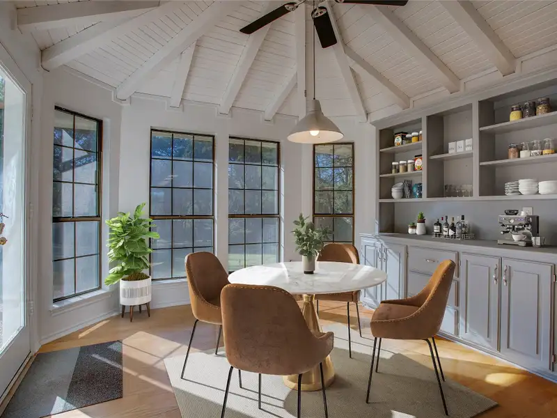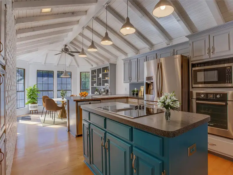 - Vaulted wood-planked ceilings in kitchen