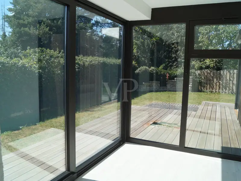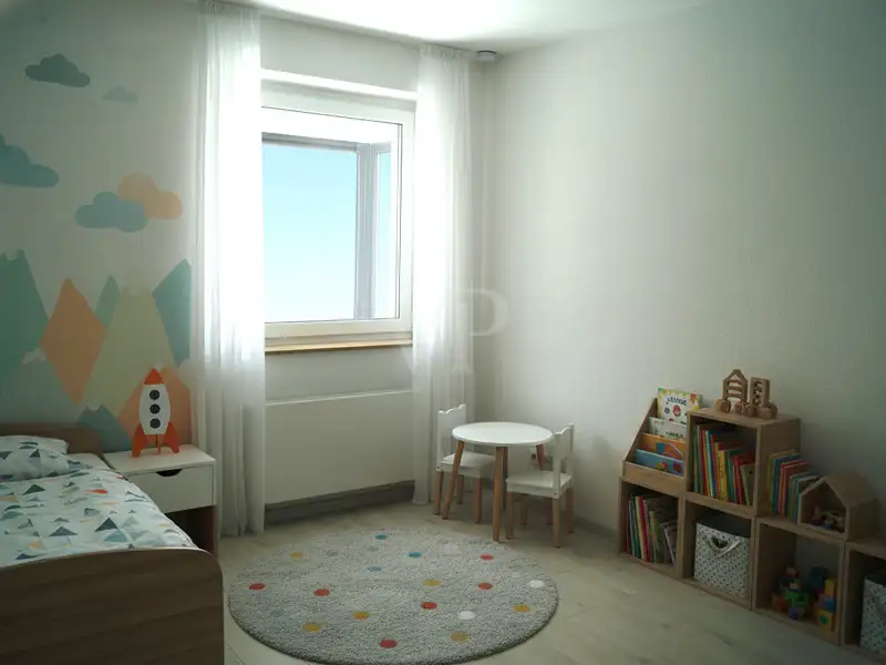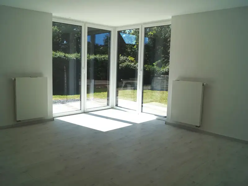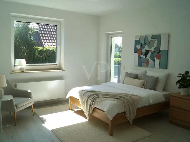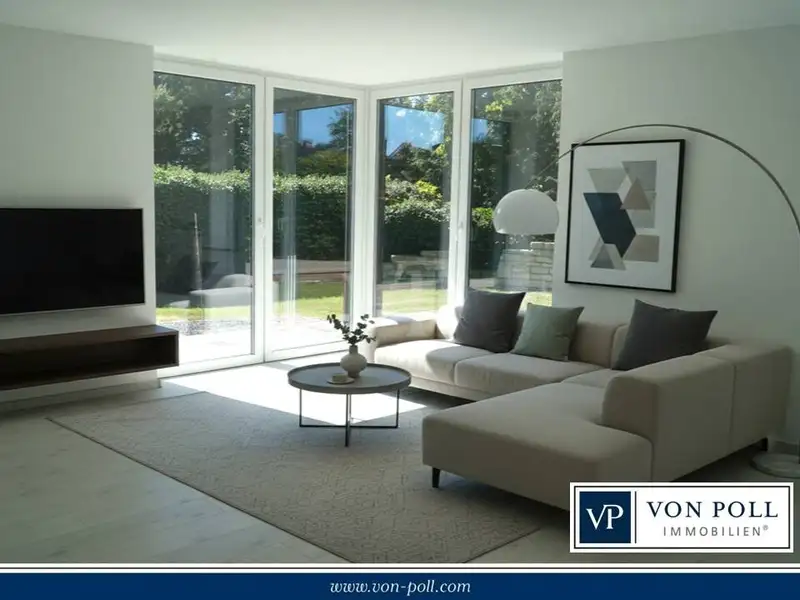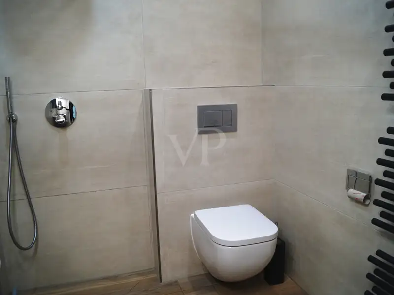 The heart of the apartment is the large living and dining area. Thanks to floor-to-ceiling windows, it is flooded with light and offers direct access to the sheltered terrace. Elegant downlights create an atmospheric ambience here in the evening. From the terrace, you can access the 250 m² private garden with automatic sprinkler system - easy to maintain and ideal for relaxing hours outdoors.