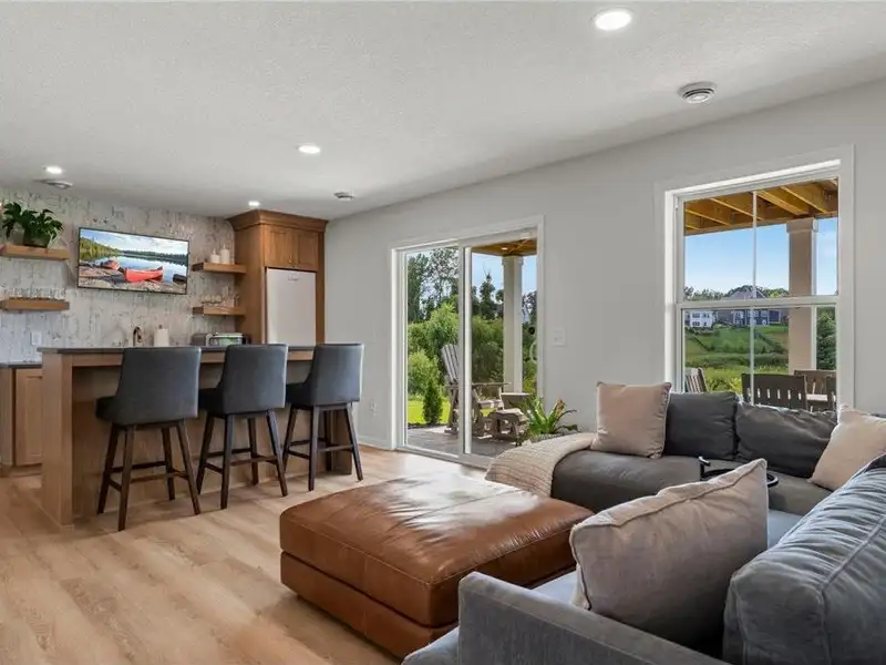 Welcome to the Somerset, one of the Harvest's most desired floor plans! Discover your dream home nestled on a breathtaking lot featuring a pond and serene natural views. This beautifully upgraded residence offers the perfect blend of luxury, comfort, and modem convenience. The main floor boasts a warm and inviting living area featuring a beautiful fireplace flanked by custom built-in cabinetry - ideal for cozy nights or entertaining guests. Expand your entertaining to the newly finished outdoor screen porch with gas fireplace and beautiful deck overlooking wet lands and wooded green space. Continue your entertainment to the newly completed lower level, includes additional wet bar with refrigerator and floating shelves and a countertop bar with stool space, dedicated exercise space, additional 3/4 bath and bedroom with oversized walk-in storage/closet. Additional outdoor space offers stamped concert patio space for additional entertaining!! The chef inspired kitchen is a true highlight, complete with a spacious butlers pantry, upgraded appliances and quartz countertops. Elegant primary suite with large windows offering picturesque views of wildlife, spa inspired bath, large walk-in shower and oversized custom closet. Enjoy additional entertaining space in upper bonus room with dry bar, floating shelves and beverage refrigerator. Upper levels includes four large bedrooms and extremely spacious laundry room. Neighborhood includes parks, waking/bike trails and easy access to 212, schools, city parks and beach. This home has been thoughtfully designed to accommodate every need with comfort and elegance-don't miss your chance to make it yours!
