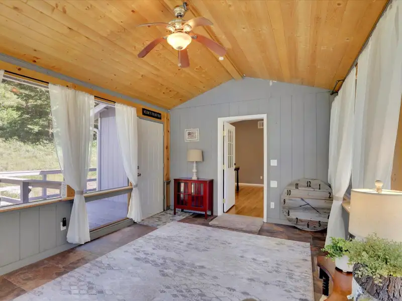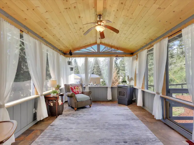 - Spacious sunroom with tile flooring and pellet stove