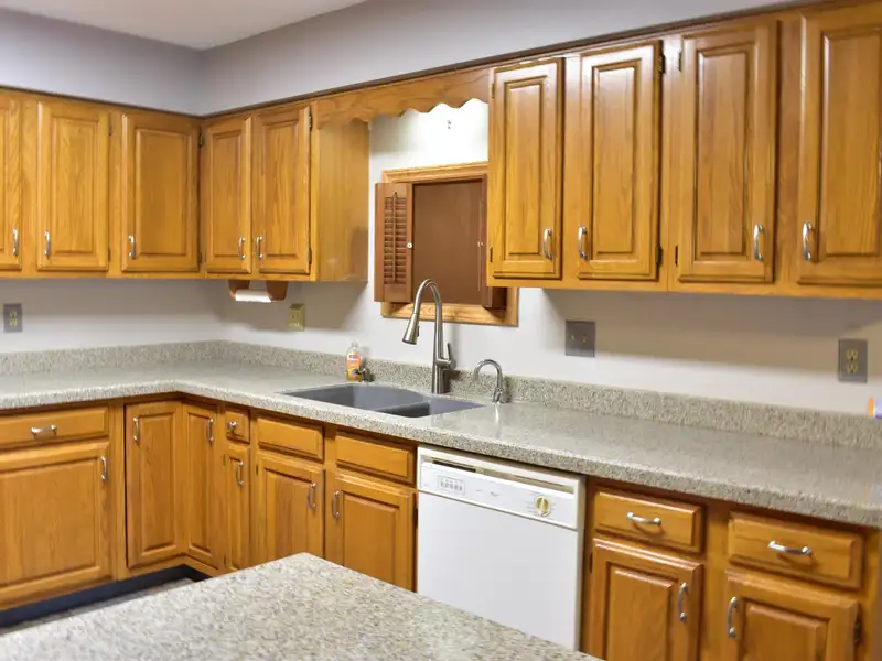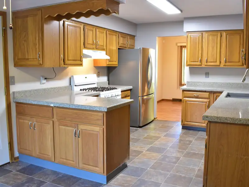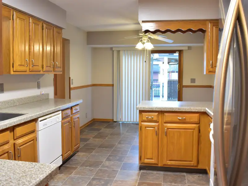 - Eat-in kitchen with oak cabinets, granite