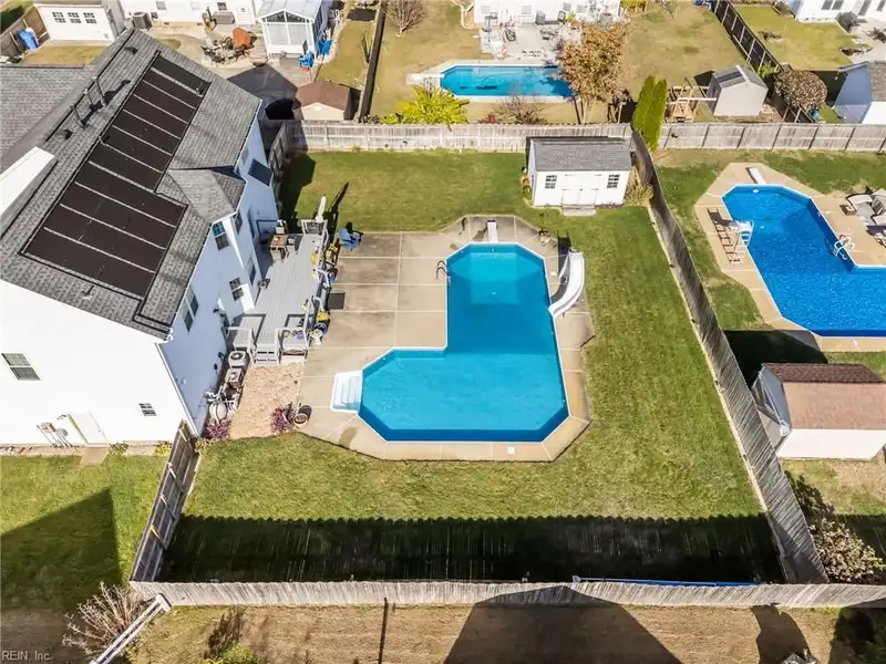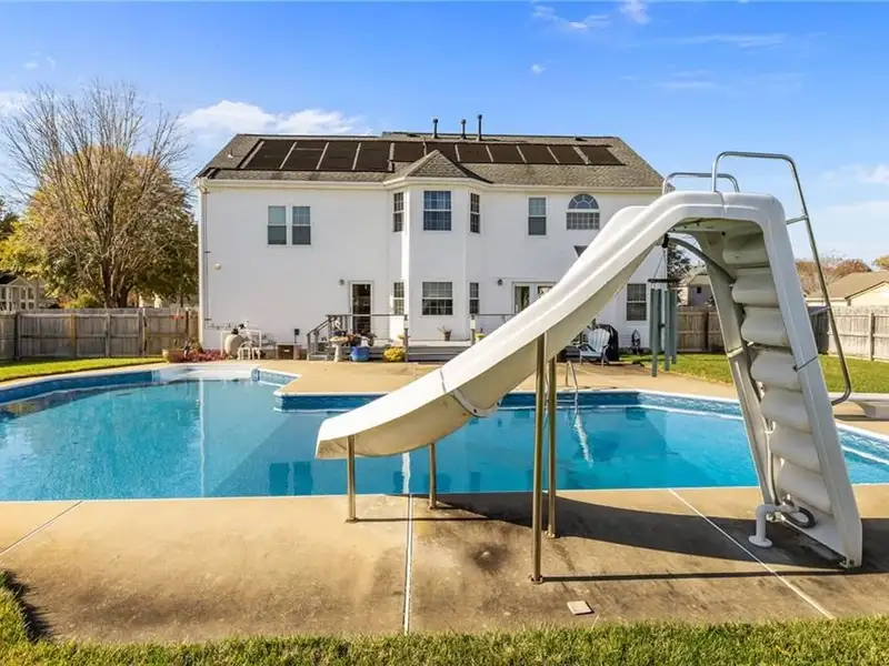 - L-shaped solar-heated pool with large shallow end
