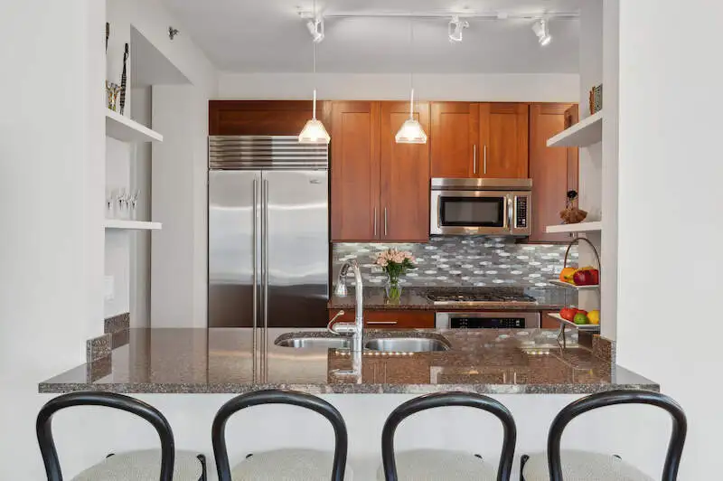 - Kitchen with cherry cabinets and granite island