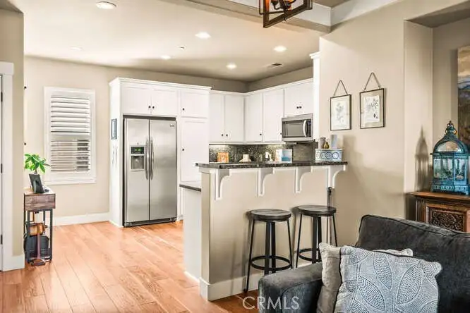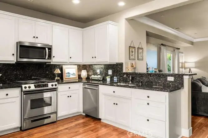- Open kitchen with granite counters, stainless steel