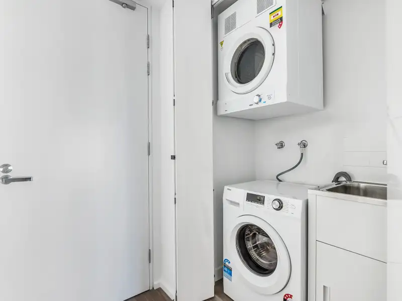 The generously sized bedroom includes a built-in wardrobe and balcony access, while the sleek bathroom and European laundry-complete with washer and dryer-enhance everyday practicality. Comfort is assured year-round with ducted reverse-cycle heating and cooling and double-glazed windows throughout. A secure allocated car space and storage cage add further convenience, rounding out a low-maintenance urban sanctuary in the heart of the City.