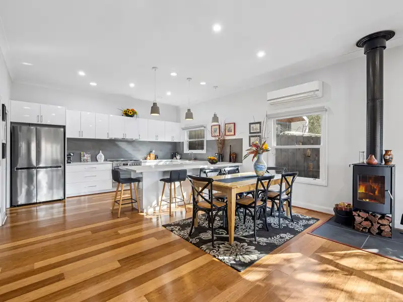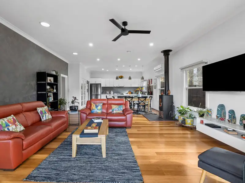 The spacious open-plan kitchen, dining, and living area is the heart of the home-bathed in natural light and perfect for both relaxed living and entertaining. A wood heater adds a rustic touch and warmth in the cooler months, while a reverse cycle system ensures comfort year-round. A dedicated wine bar adds an element of sophistication and convenience for those who love to host.