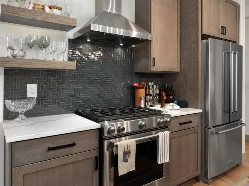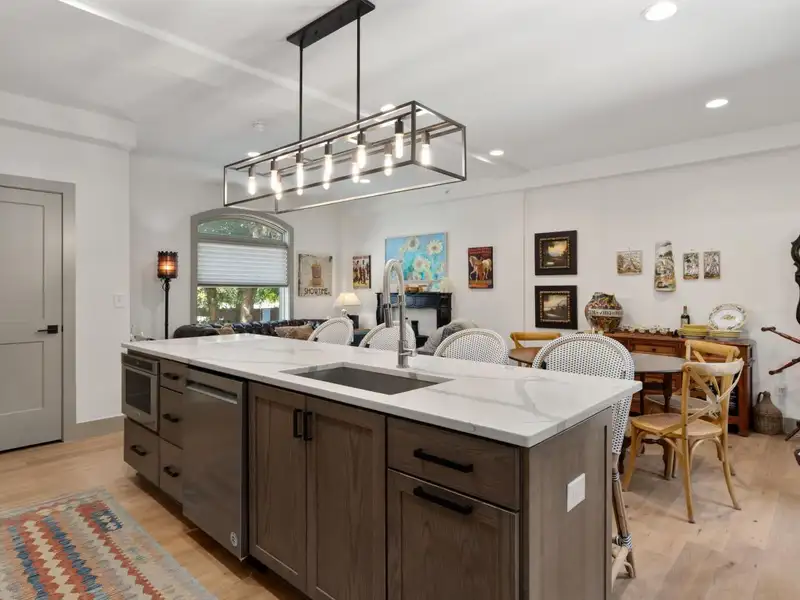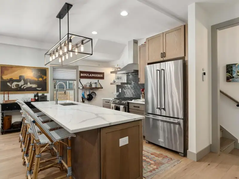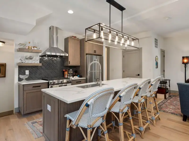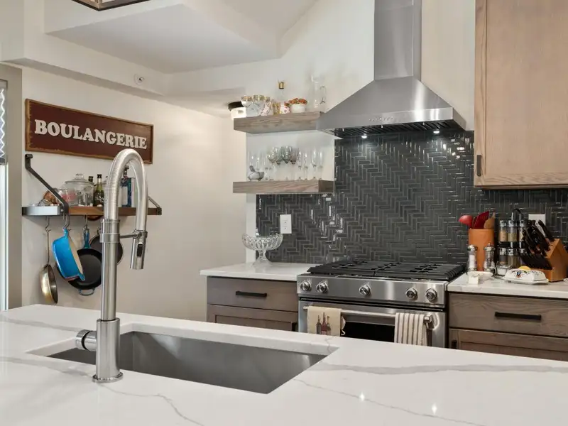 - Kitchen with quartz countertops and stainless appliances