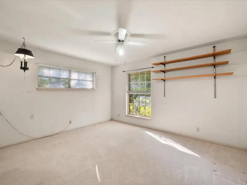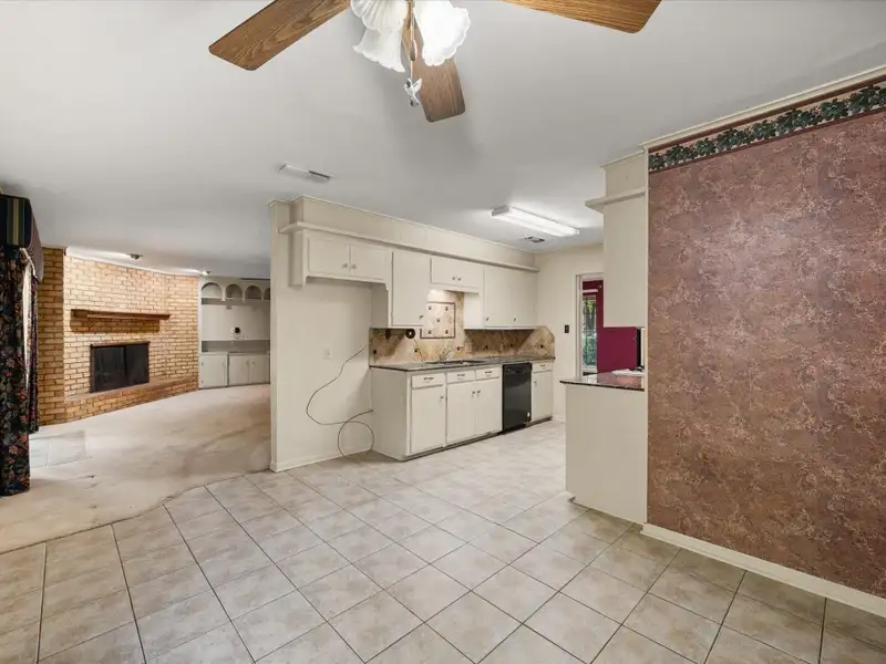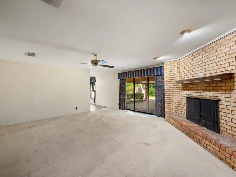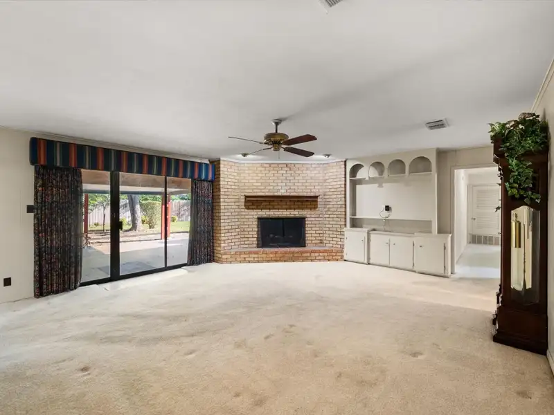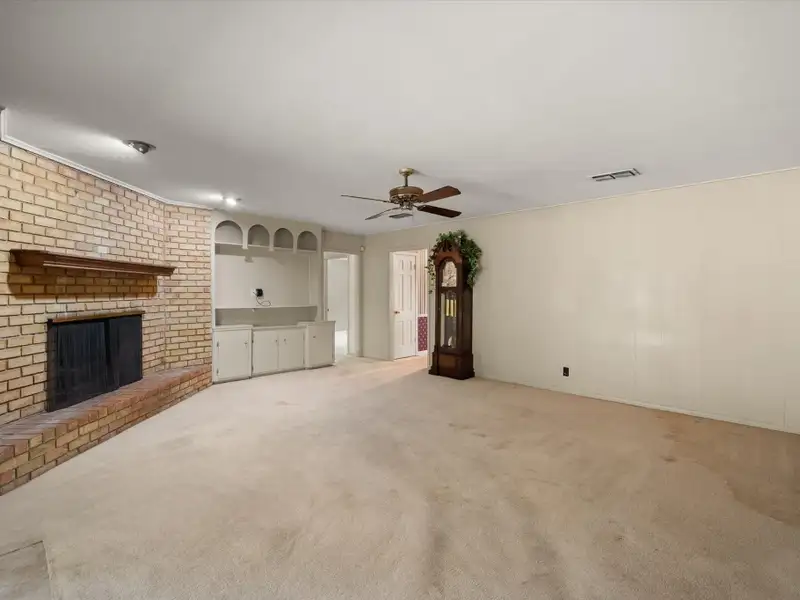 - Brick fireplace with built-in shelving