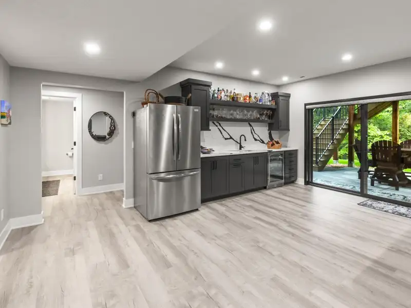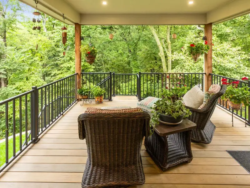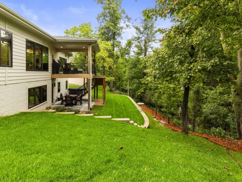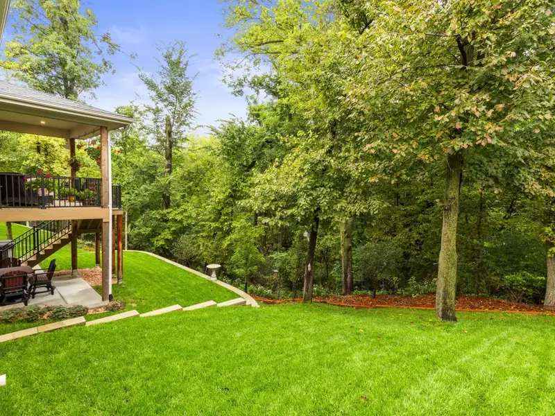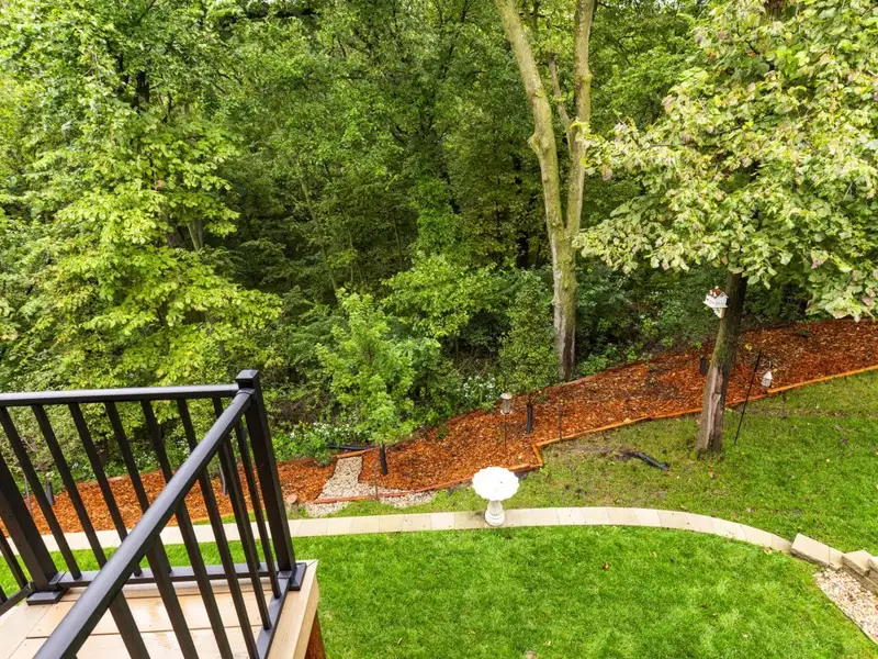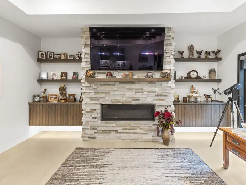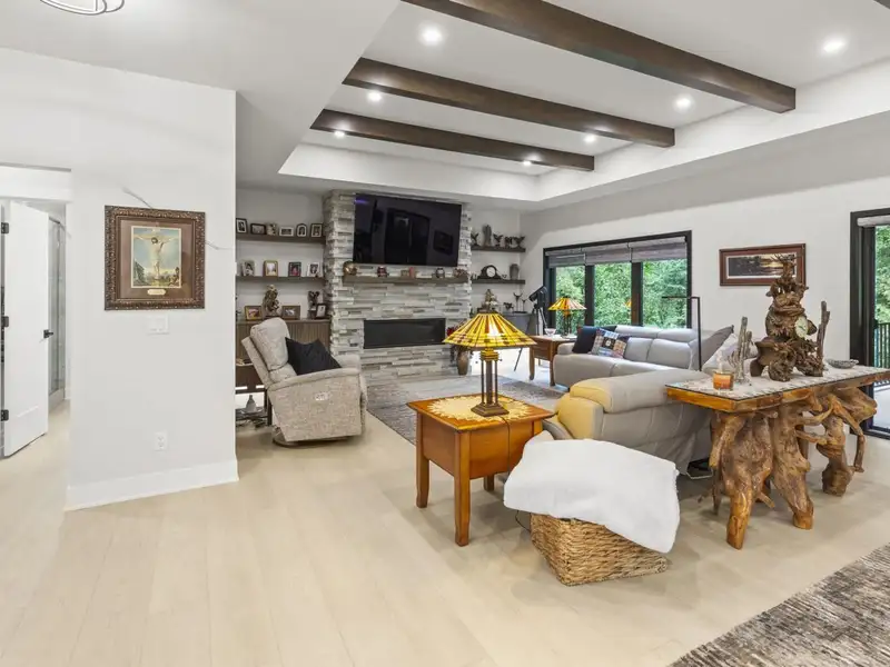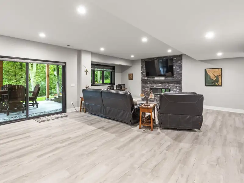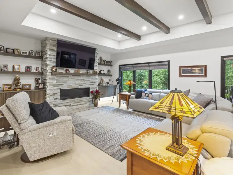 - Stone fireplace with wooded views
