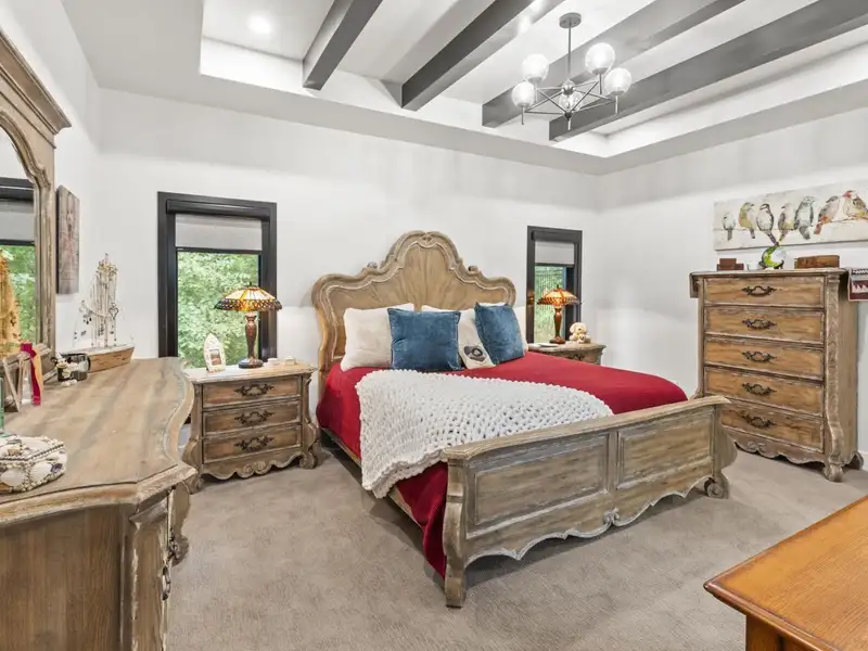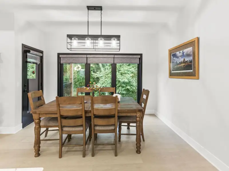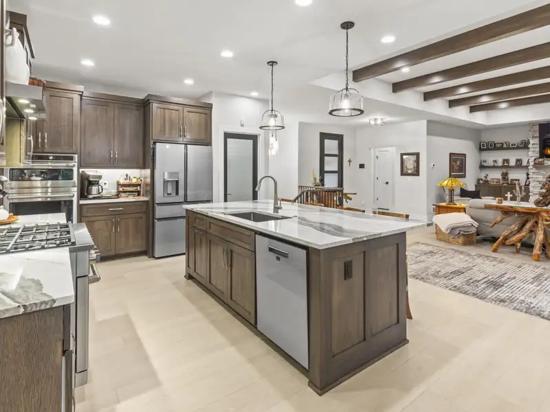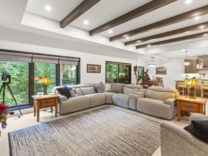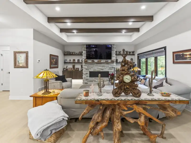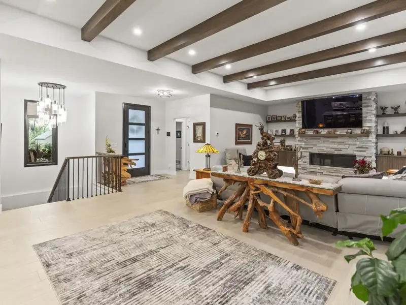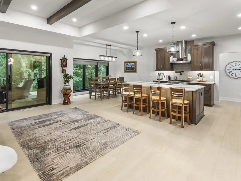 - Open concept with ceiling beams