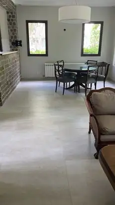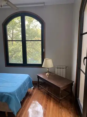 P. B. Hall de entrada; amplio living comedor con estufa hogar y biblioteca, con ventanales al parque y pileta de natación, recientemente construida. La cocina está recién remodelada e integrada con barra y mesada, ambiente muy funcional; escritorio (opcional dormitorio ); toilet de recepción con ducha; habitación y baño de servicio; lavadero; cochera cubierta para un auto.