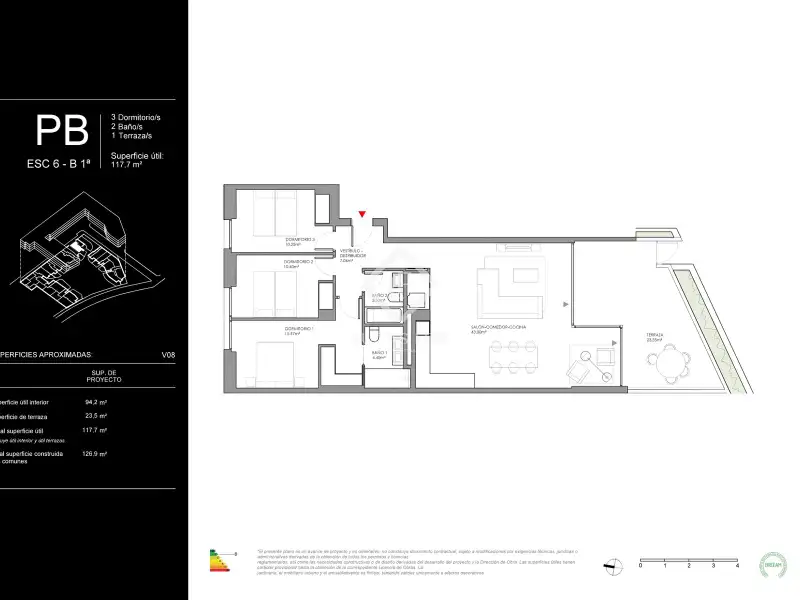 The dining room living room area with open kitchen includes a large private terrace of 23 m² where you can enjoy the wonderful Mediterranean climate. On the other hand, the night area has three double bedrooms, the main one with its own private bathroom.