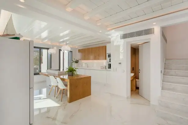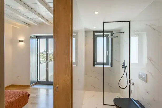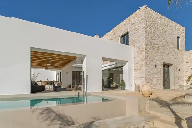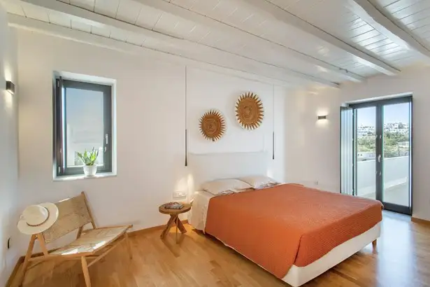 The villa is located in Piso Livadi, Paros and covers an area of 530 square meters. It has an urban style and is surrounded by lush trees and plants. The ground floor consists of an autonomous residence with a garden view, which includes one bedroom with an ensuite bathroom (double bed), a living room, fully equipped kitchen with high-tech electrical appliances, a dining room, a loft for two persons (two single beds that can be joined to form a double), an outdoor dining table, and a sofa with two small coffee tables. There is also an indoor private parking for two cars, a gym room, and an autonomous room for the housekeeper. An elevator that stops on the first and second floors can be accessed through the parking. The first floor features a big living room, dining room, fully equipped kitchen with high-tech electrical appliances, and a kitchen island for cooking attached by a table-bench for four persons. There is also a WC, a big terrace with sea view, a private pool, outdoor living room and dining table, pillow chairs, and sun beds. The second floor has three bedrooms with their ensuite bathrooms (one with a bathtub and two with showers), big modern wardrobes for each room, and a common terrace for the three bedrooms with sea view with butterfly chairs, pillows, and a coffee table. The villa is equipped with central cooling unit, alarm, and a safe box at the master bedroom. Daily cleaning, three times per week change of sheets, daily change of towels, pool and beach towels, laundry made by the housekeeper, bathroom essentials, and slippers are also provided. The lady for cleanliness will be exclusively for the service of the residence and not for the clients. The villa is conveniently located just 30 meters away from the beach of Piso Livadi, fine restaurants with fresh fish and fine cuisine, mini/supermarkets, clothing stores, cafes, tourist shops, bus station, and ATM machines. Daily cruises to small Cyclades islands with private cruising boats or with the line ships can be found at the port of Piso Livadi. The villa is also close to other nice beaches with blue flag, such as Logaras Beach, Golden Beach, Molos, Drios, etc., with activities like surfing, scuba-diving, etc. There are also very nice and well-organized beaches with bars, restaurants, etc. Features: •Private pool •Outdoor living and dining areas with sea view •Fully equipped kitchens with high-tech appliances •Gym room •Elevator •Central cooling unit •Alarm system and safe box •Daily cleaning and change of towels •3 times per week change of sheets •Laundry service •Bathroom essentials and slippers •Beach and pool towels