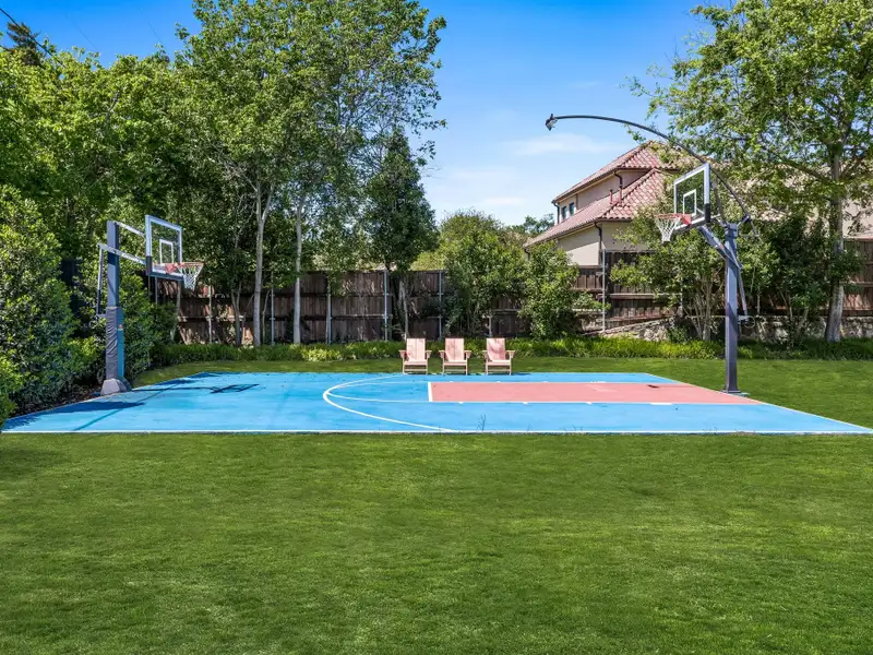 - Private backyard with pool, spa, fire pit, sport court