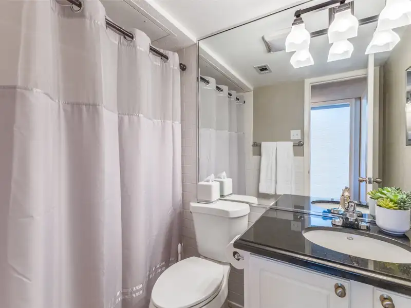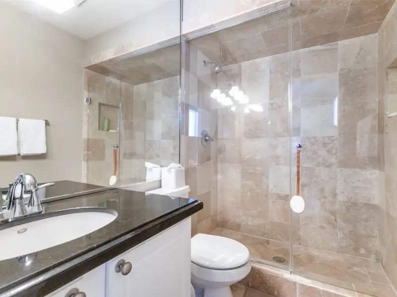 - Marble-tiled showers and granite vanities