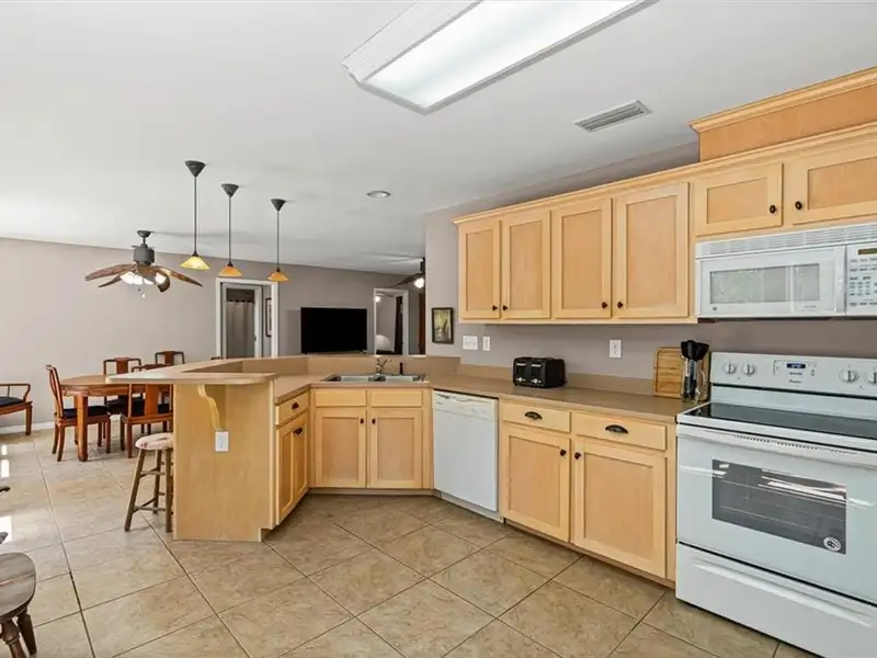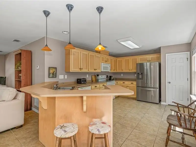 - Kitchen with wood cabinetry, breakfast bar, and pantry