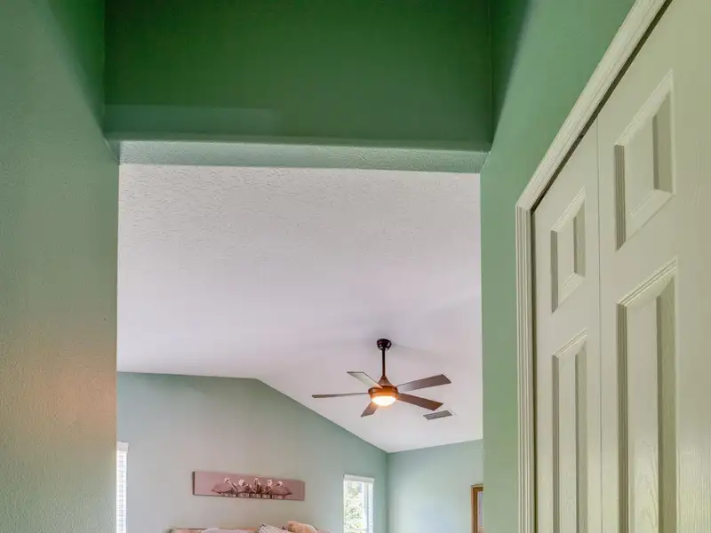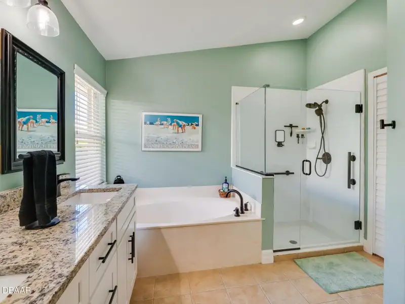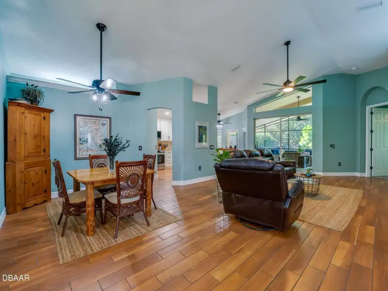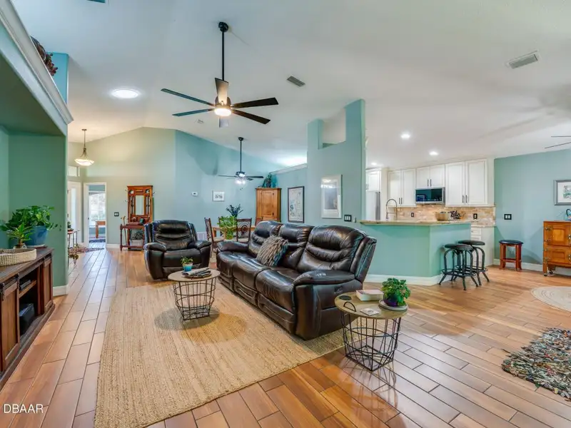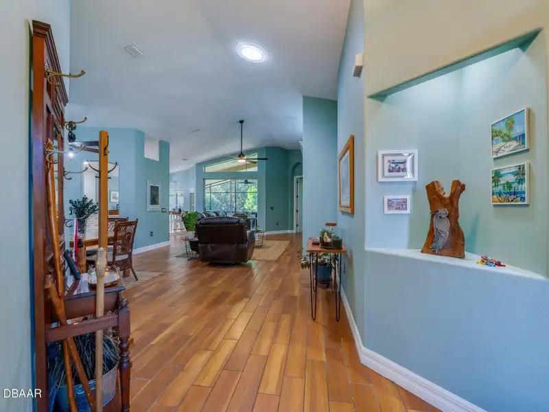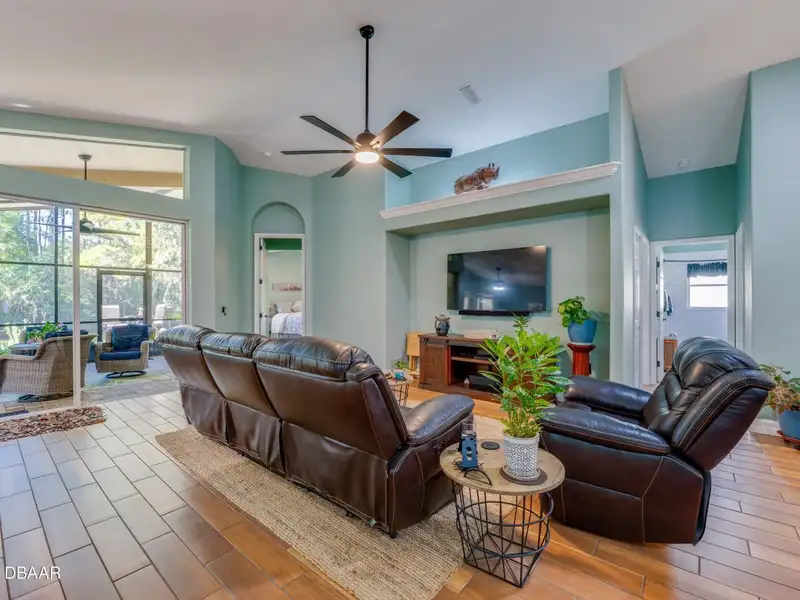 - Vaulted ceilings with wood-look tile floors