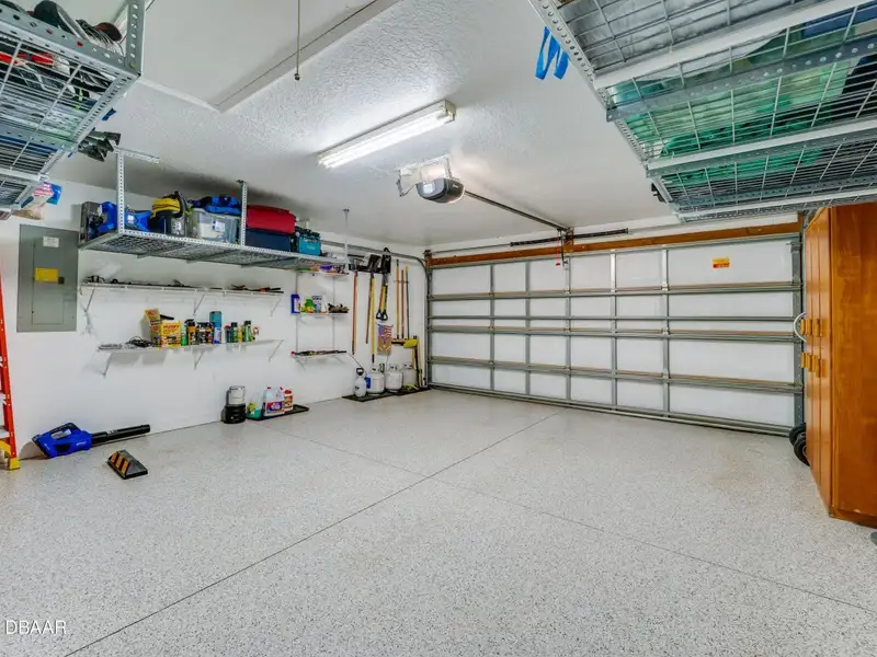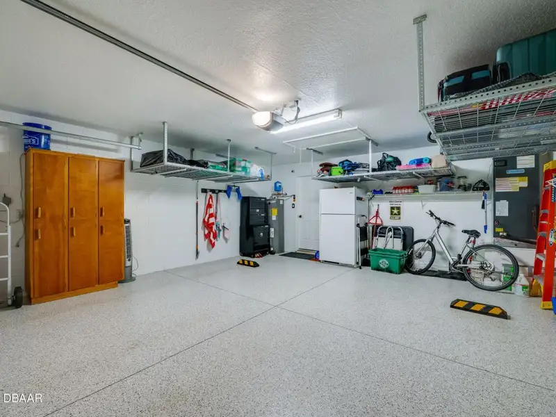 - Epoxy-finished garage with overhead storage