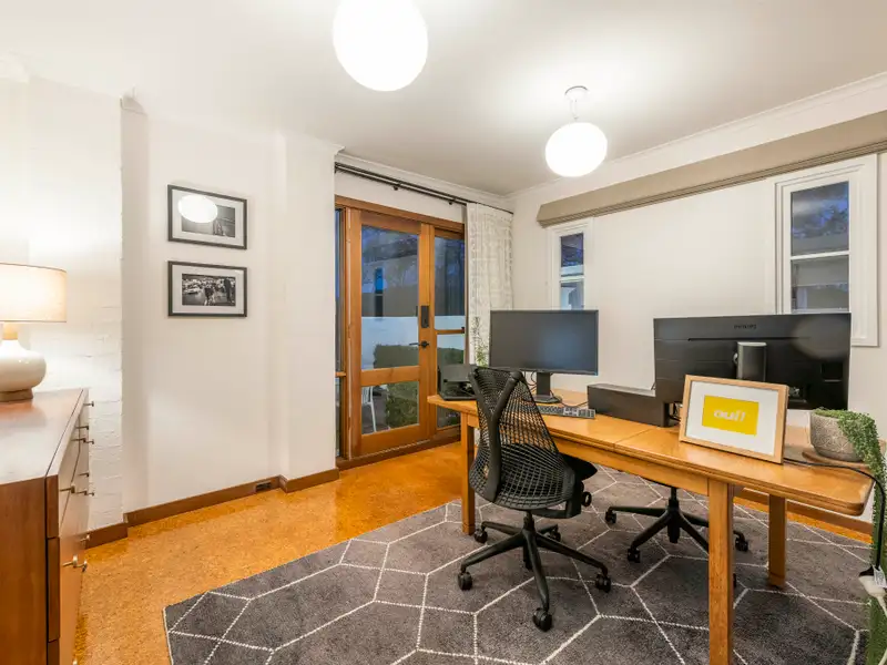 The main residence offers three generous bedrooms, two bathrooms, a formal living room with fireplace, separate dining, and a light-filled family room at the rear-all complemented by polished Tasmanian oak floors, soaring ceilings, and expansive picture windows that frame tranquil garden vistas and glimpses of Red Hill bushland.