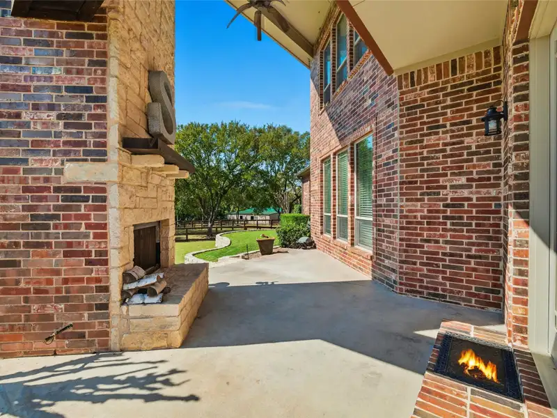 - Two-story backyard fireplace patio