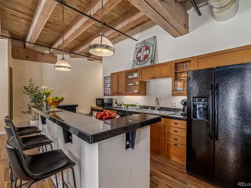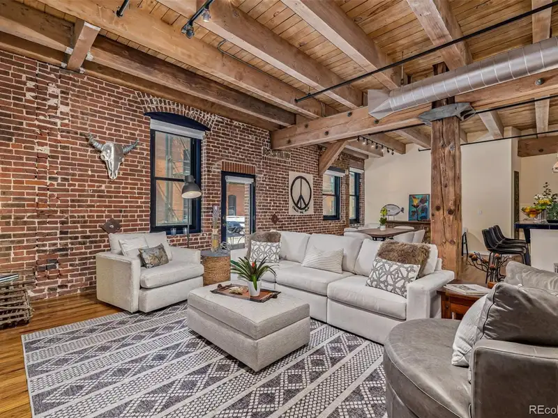 - Soaring ceilings with wood beams