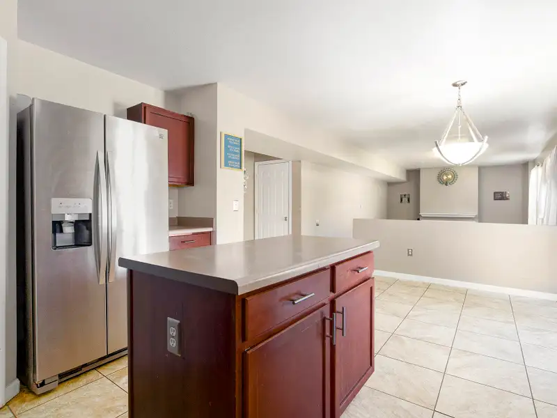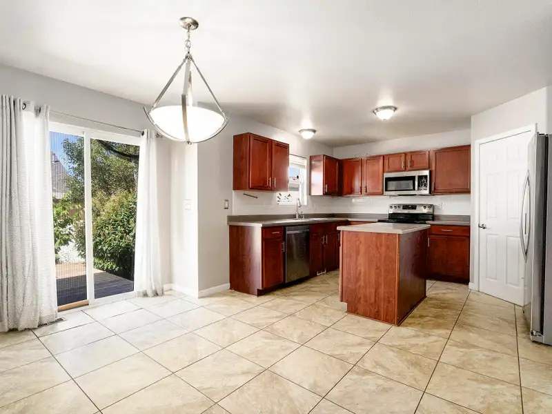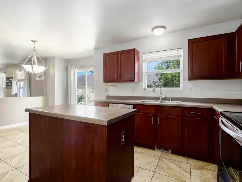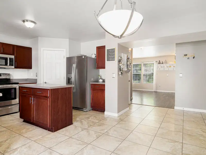 - Open floor plan with kitchen island