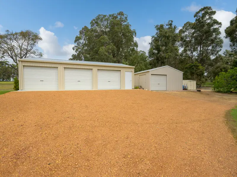 Outside, the property continues to impress with a range of practical and well-designed infrastructure, including a fully enclosed, powered, 3-bay garage, an additional double garage with single door, and 2-expansive multipurpose sheds; one featuring wet room facilities and the other perfectly suited for use as a workshop or for housing machinery.