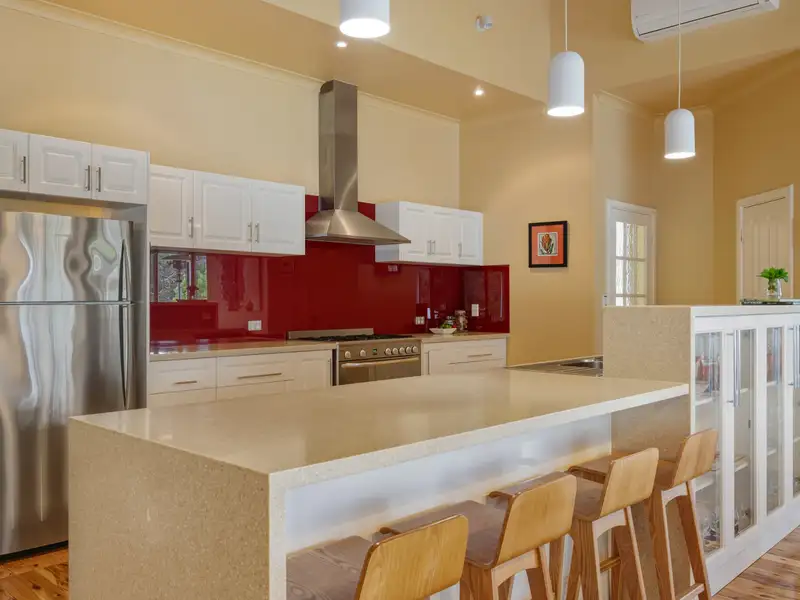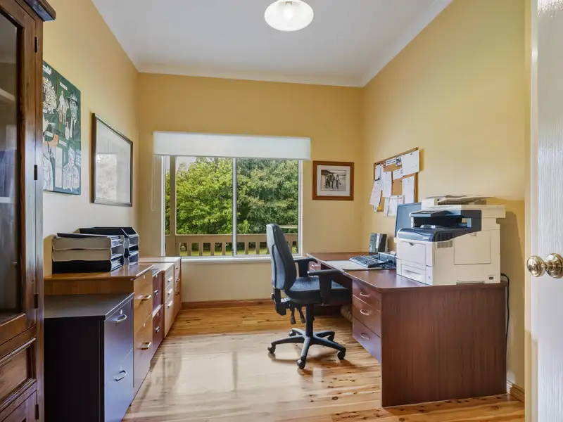 Vaulted ceilings crown the entertainer's kitchen, complete with walk-in pantry and hidden underground cellar. A newly installed wood fireplace brings warmth and ambiance during cooler months, while reverse cycle air-conditioning ensures year-round comfort. A private study or sitting room offers flexibility for work or relaxation.