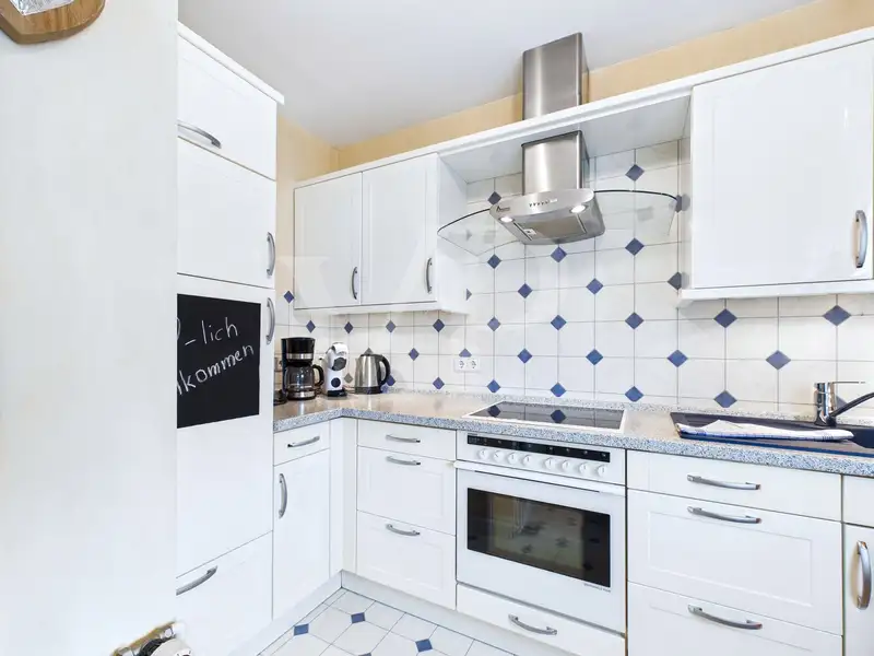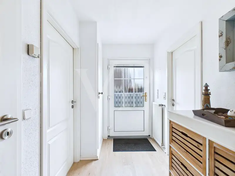 The functional floor plan becomes clear as soon as you enter the house. From the central entrance area, you have direct access to all rooms. On the right-hand side is the bright kitchen, equipped with a fitted kitchen and a cozy, small dining area by the window - perfect for relaxing hours in everyday life. A practical storage room offers additional storage space for provisions and household utensils.