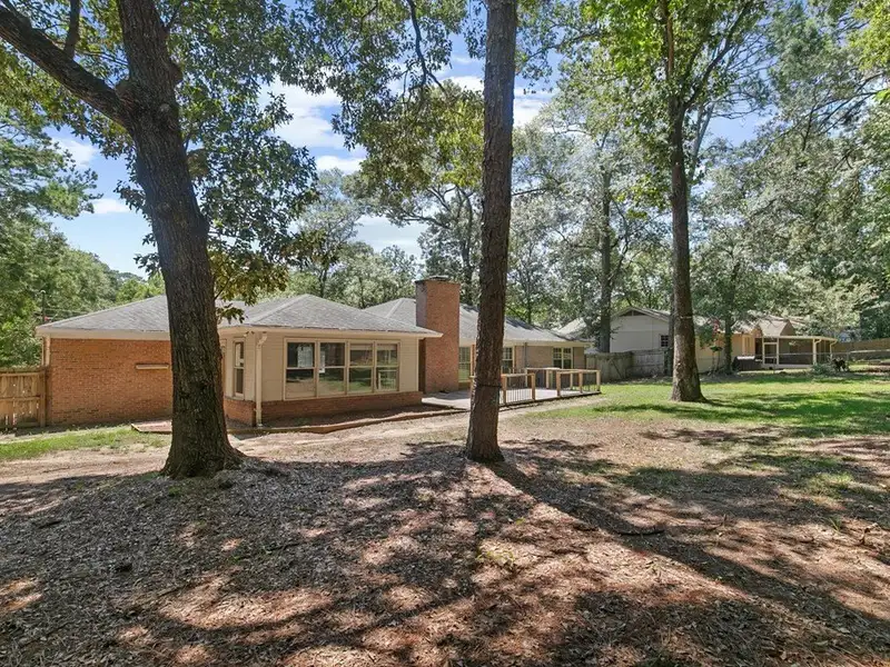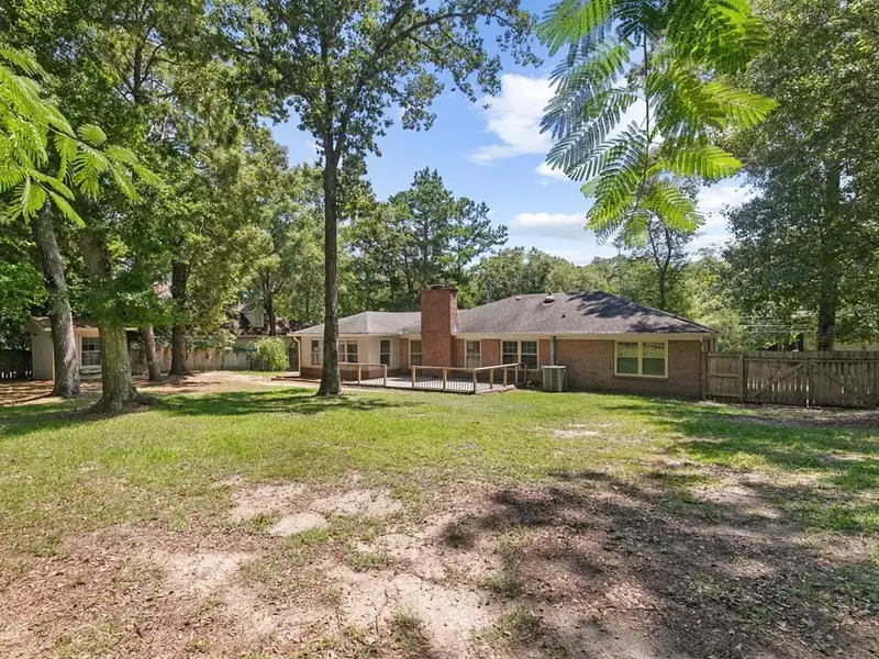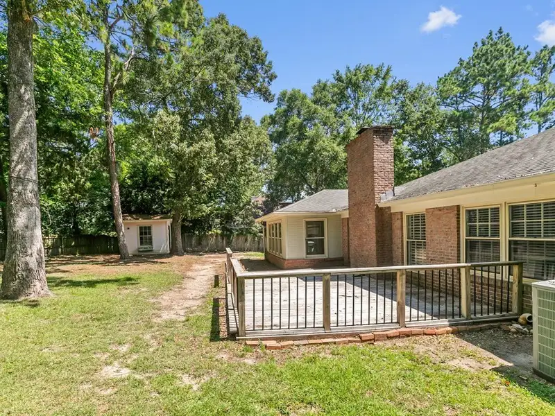 - Large backyard with deck and storage buildings