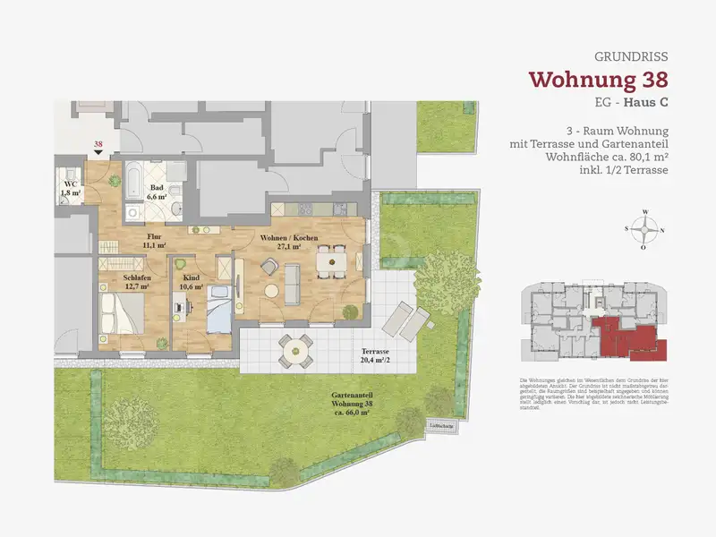 The central point of the apartment is the generously proportioned, light-flooded living room with open-plan kitchen, which offers direct access to the terrace. The large floor-to-ceiling windows create a bright and friendly atmosphere. Outside, there is an additional 66.00 m² of garden for your exclusive use, inviting you to linger.